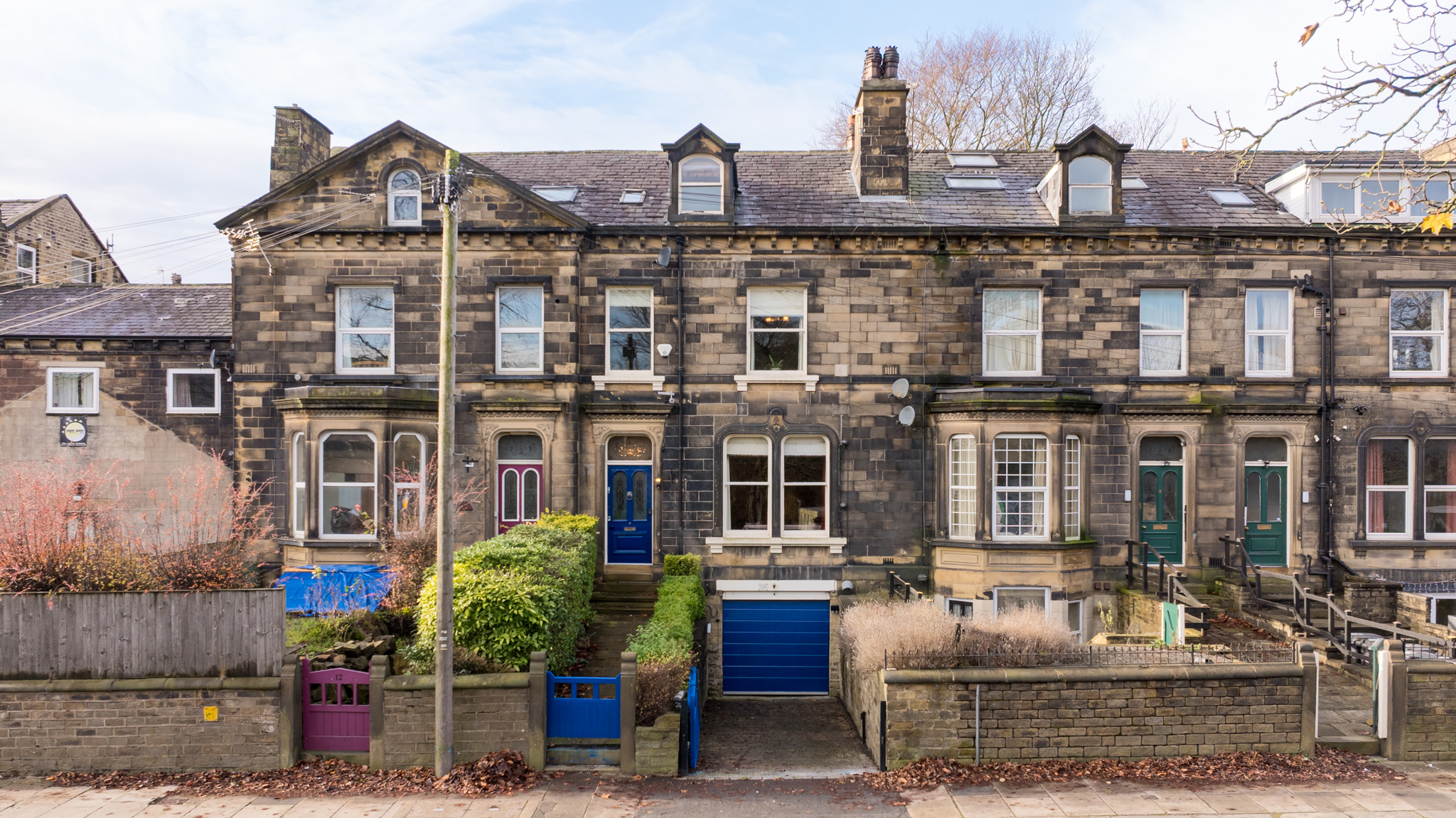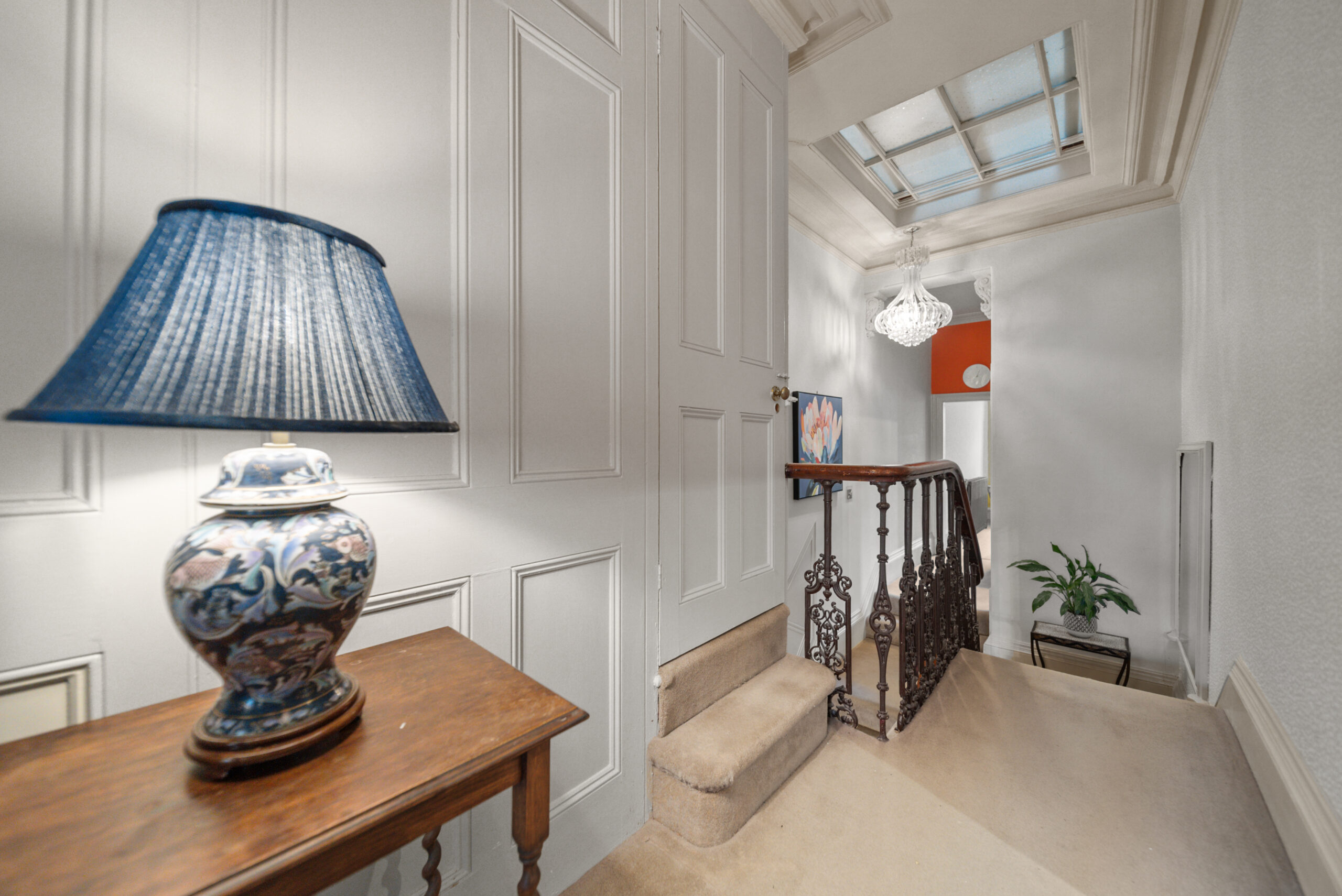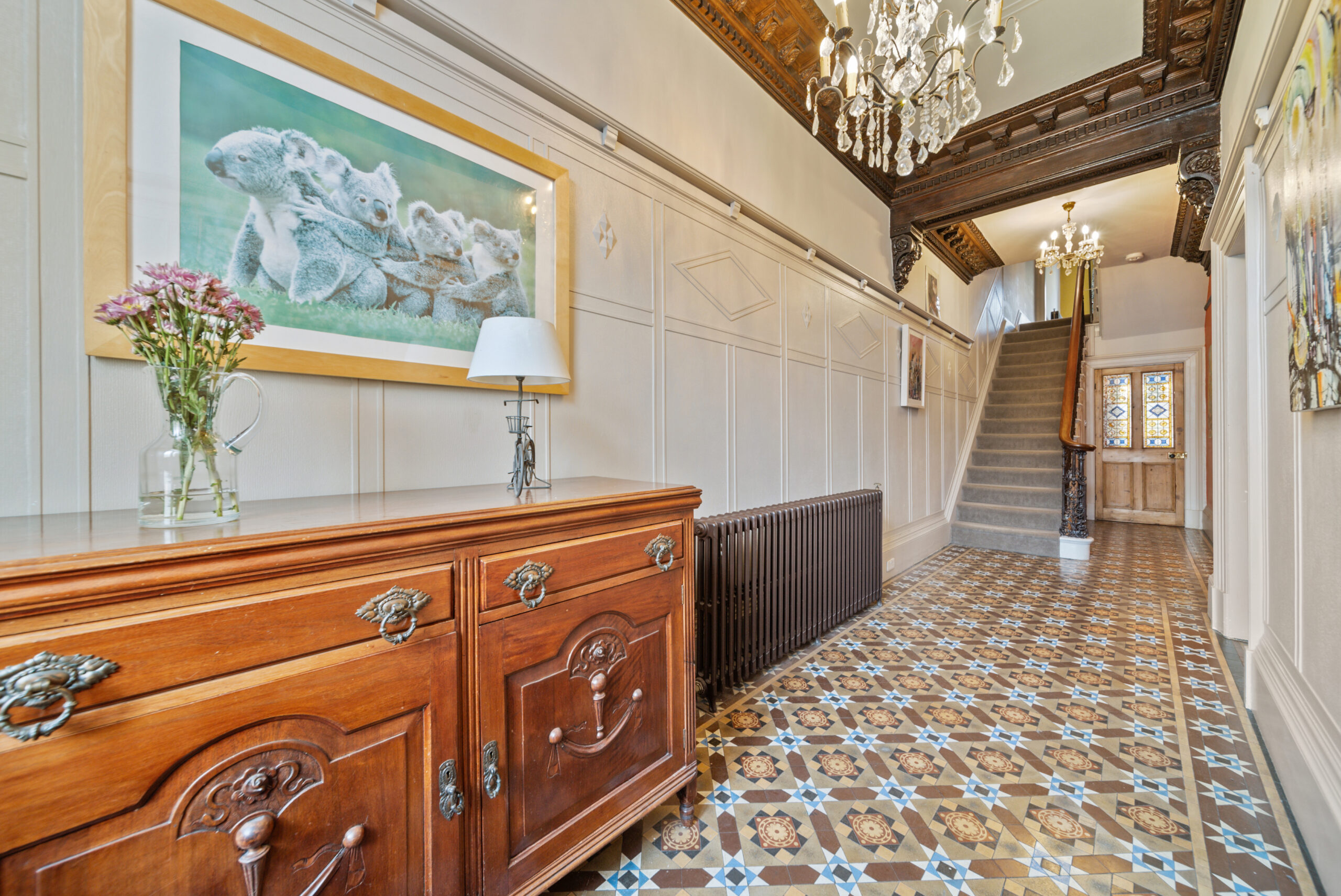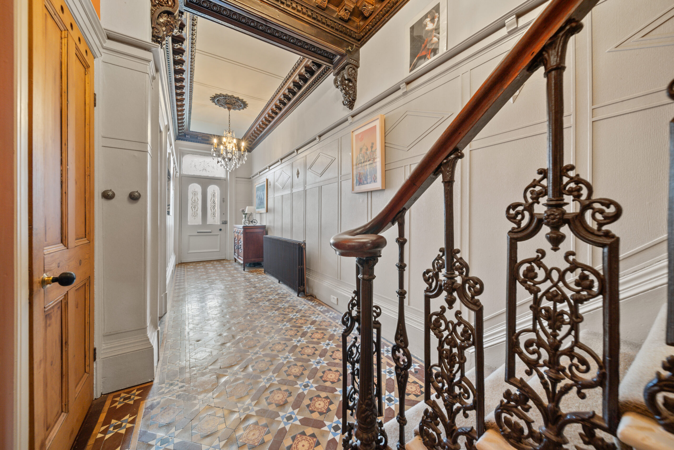 A rich blue door opens onto patterned tiles, ornate cornicing and warm panelling that speak plainly of its Victorian roots. Fireside reception rooms, a generous kitchen, six bedrooms, extensive cellars and gated parking create an elegant, practical home moments from Halifax and Manor Heath.