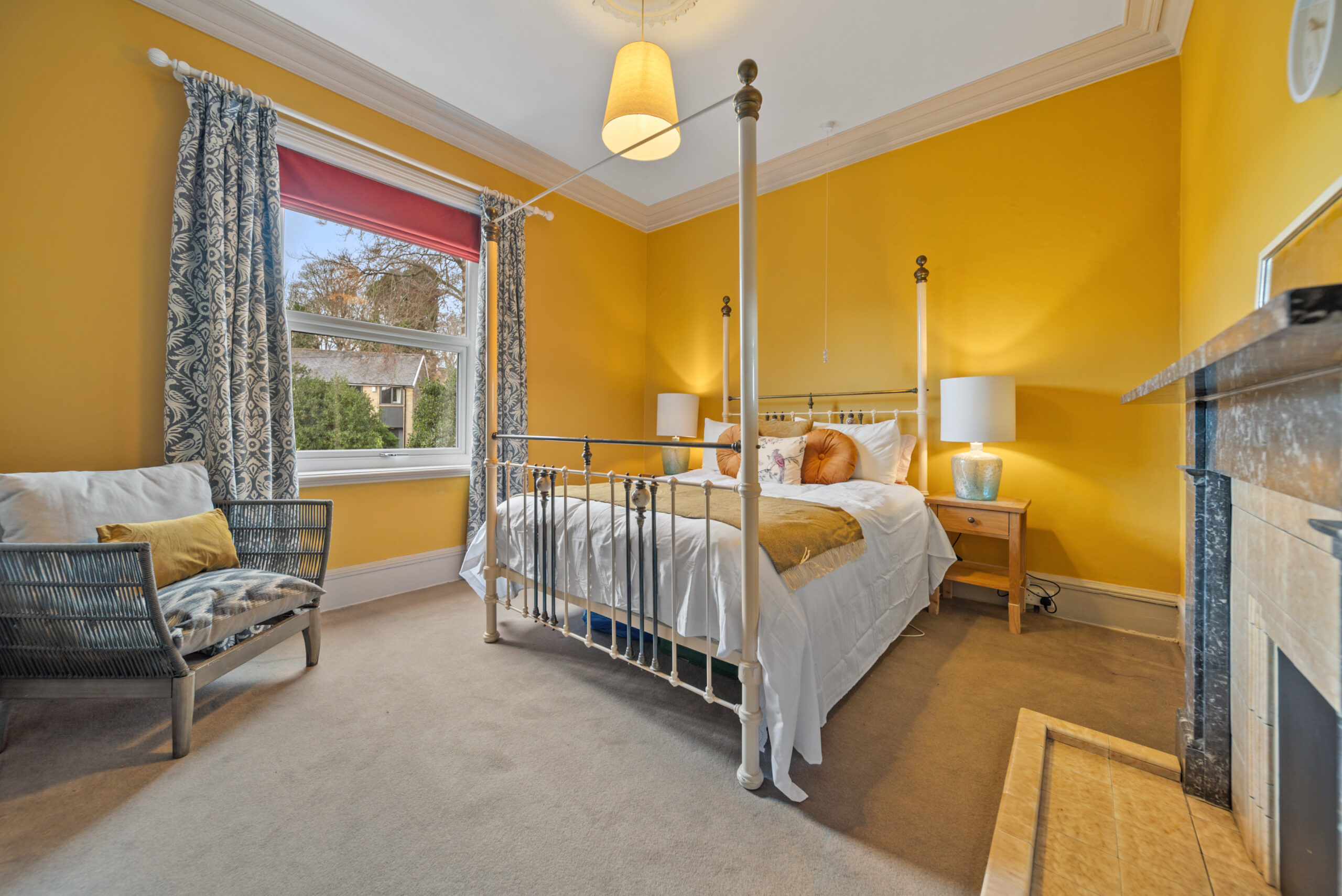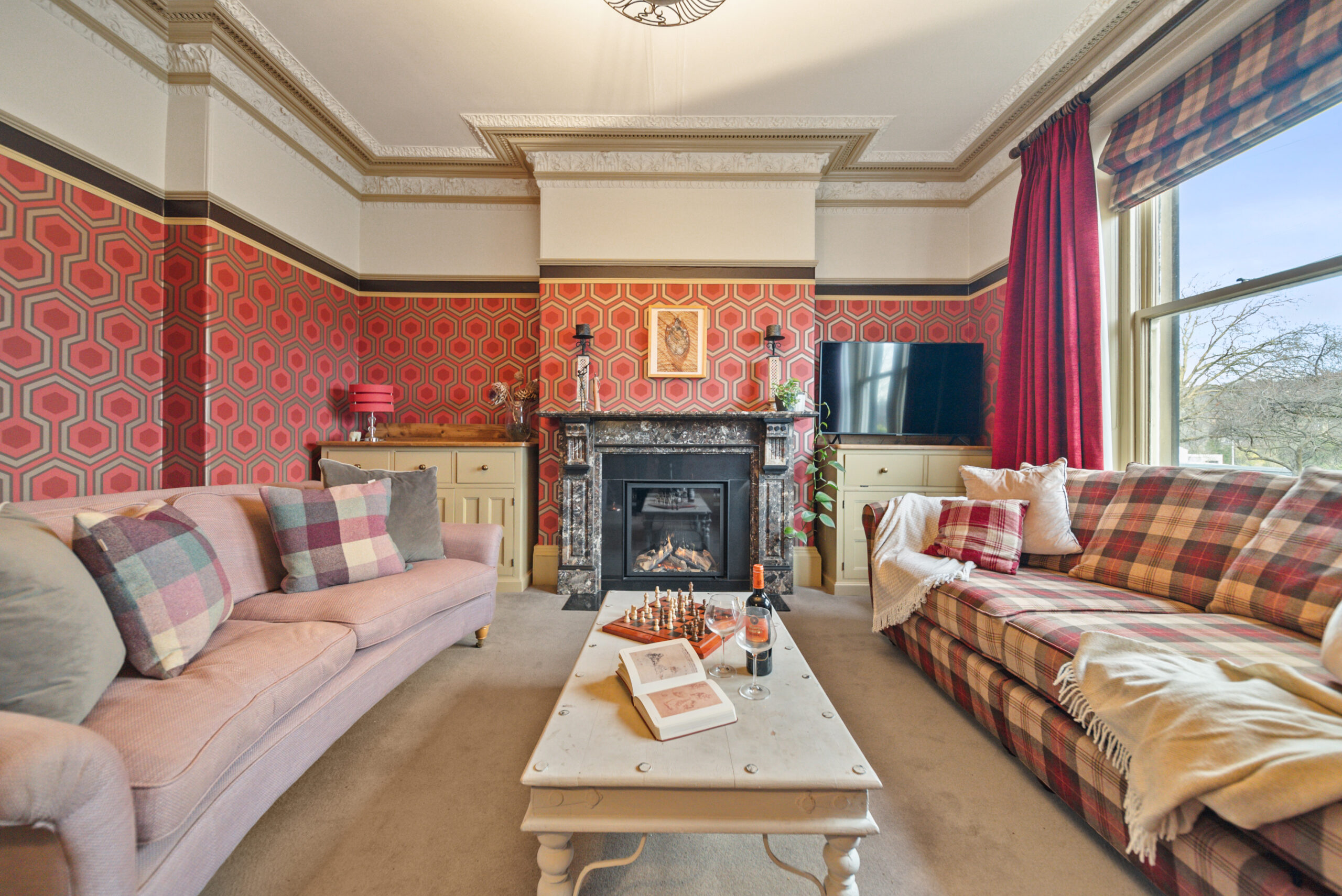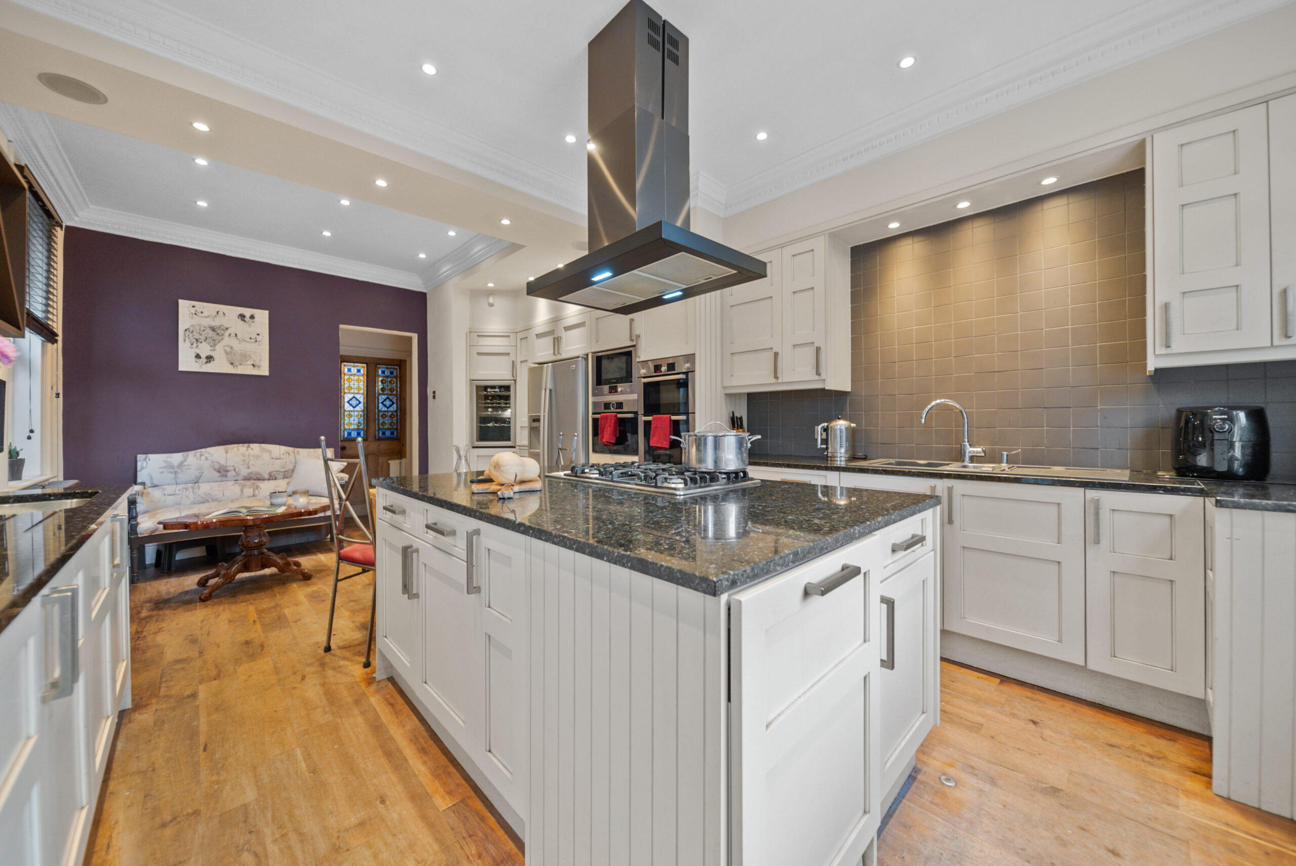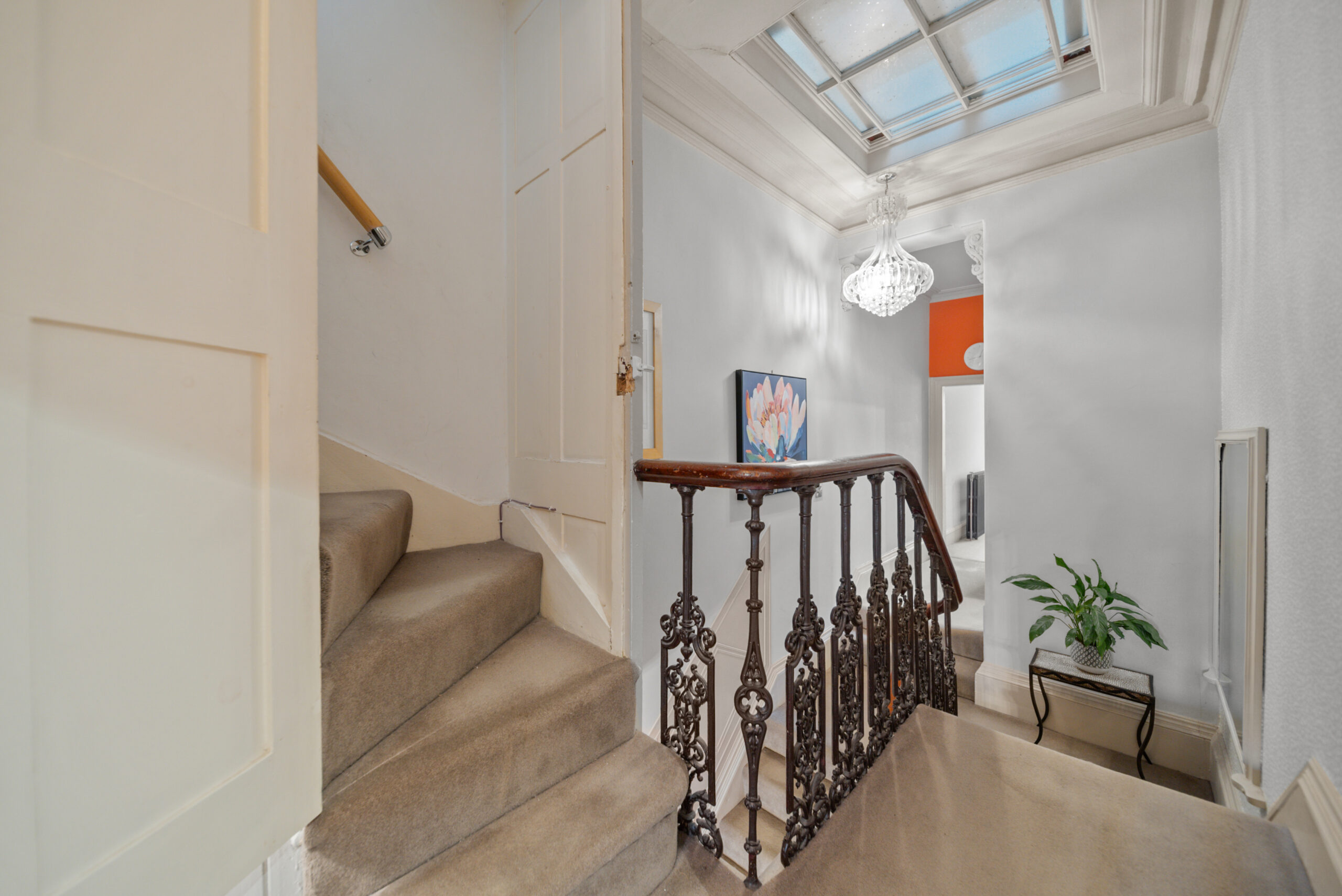 A rich blue door opens onto patterned tiles, ornate cornicing and warm panelling that speak plainly of its Victorian roots. Fireside reception rooms, a generous kitchen, six bedrooms, extensive cellars and gated parking create an elegant, practical home moments from Halifax and Manor Heath.