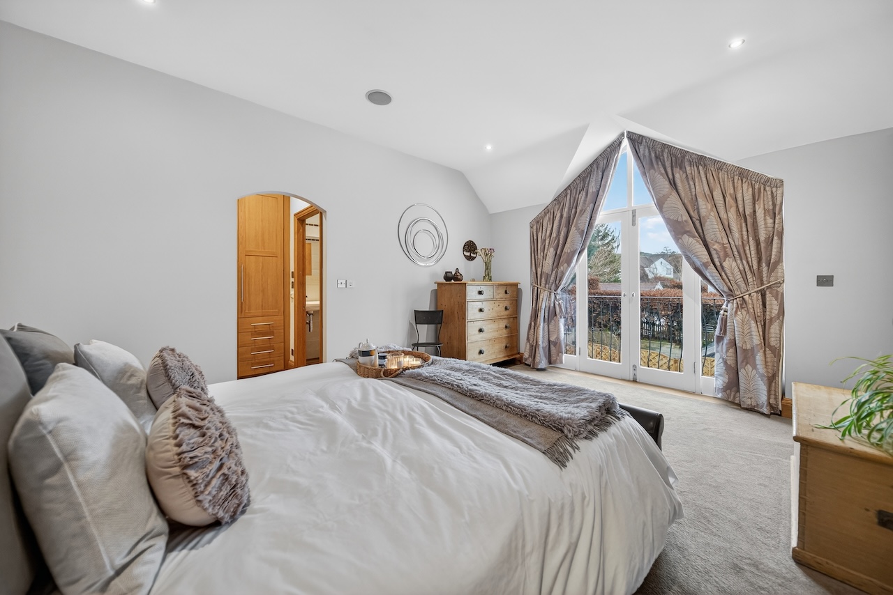 The principal bedroom feels calm and separate from the rest of the house having been part of a two-storey addition to the home by the current owners. French doors open onto a Juliet balcony overlooking the south facing garden, bringing in light and fresh air. Built-in ceiling speakers add to the relaxed feel. An arched opening leads to the dressing room with fitted storage, while the en-suite shower room is finished with tiled walls, a walk-in shower, wall mounted basin, WC and underfloor heating.