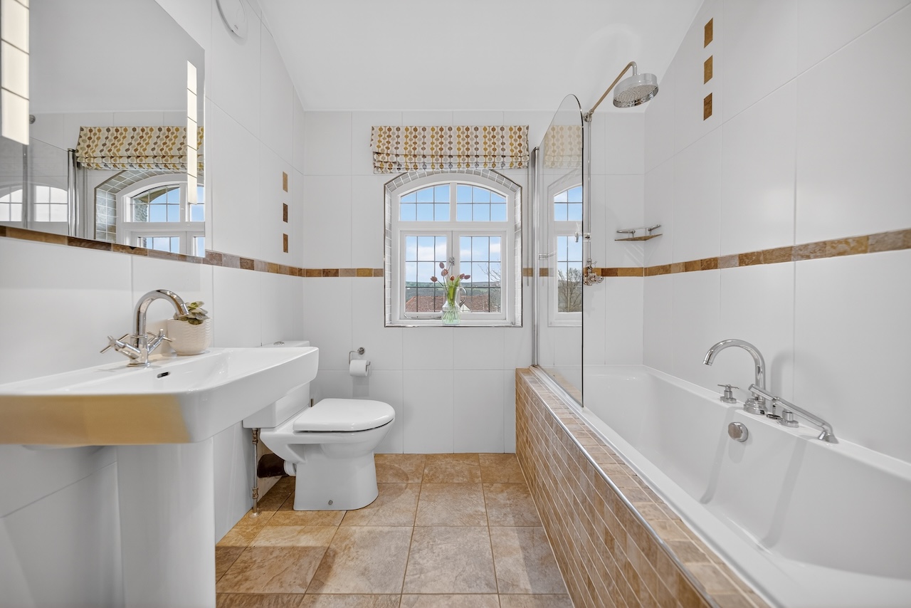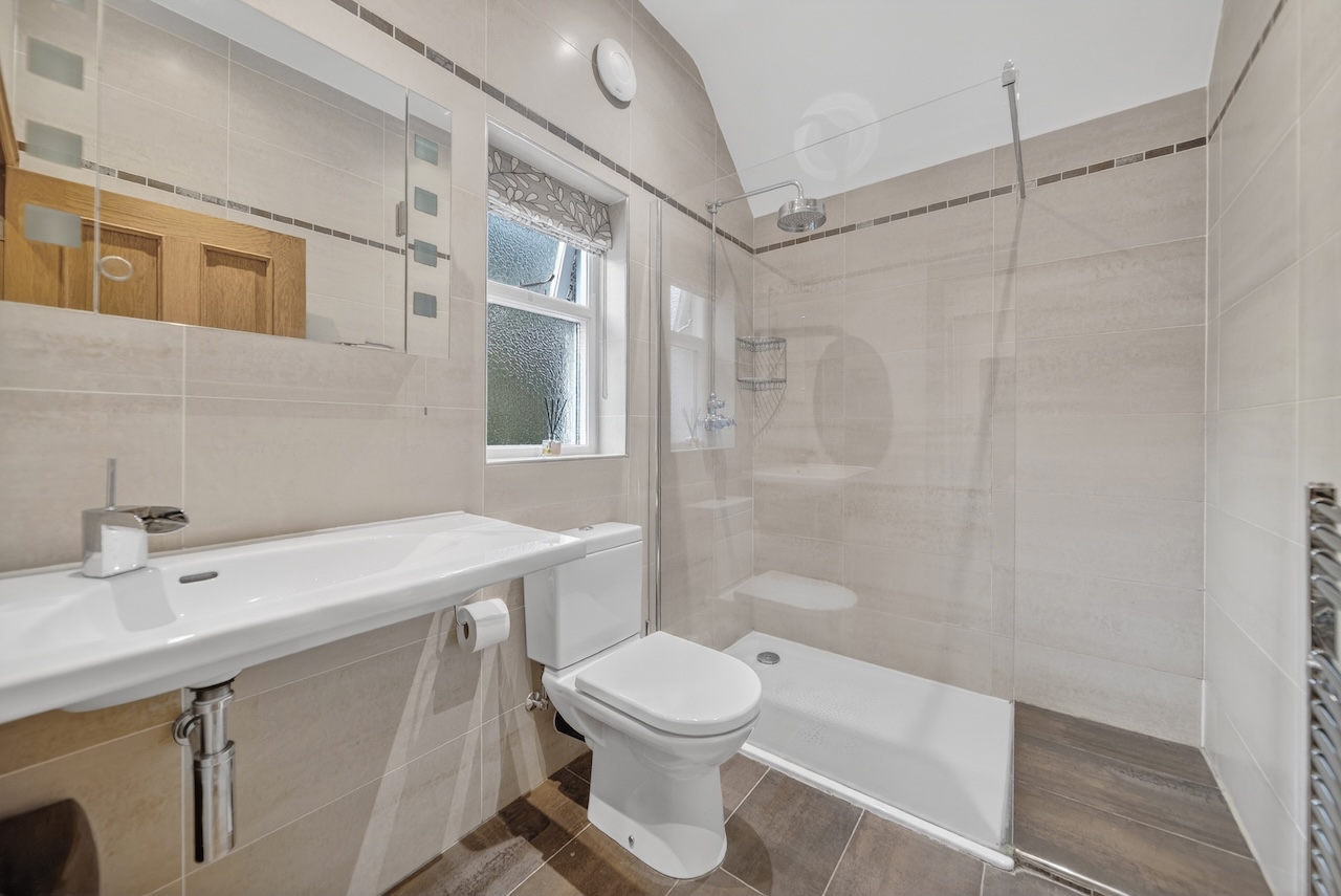 The house bathroom serves these rooms with ease, fitted with a bath and rainfall shower above, wash basin and WC. White tiled walls, underfloor heating and a front facing window make the room practical and comfortable.