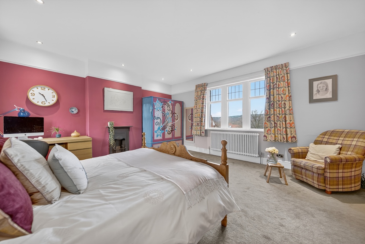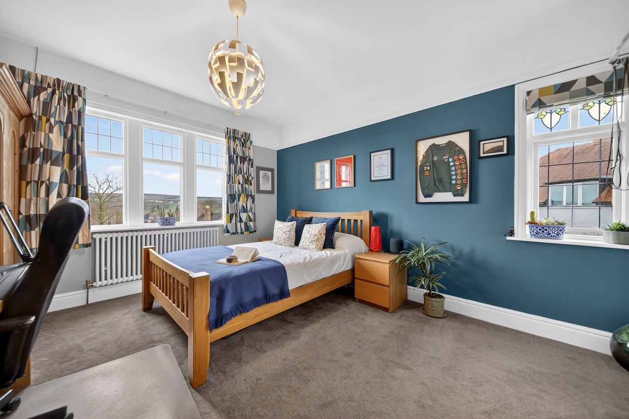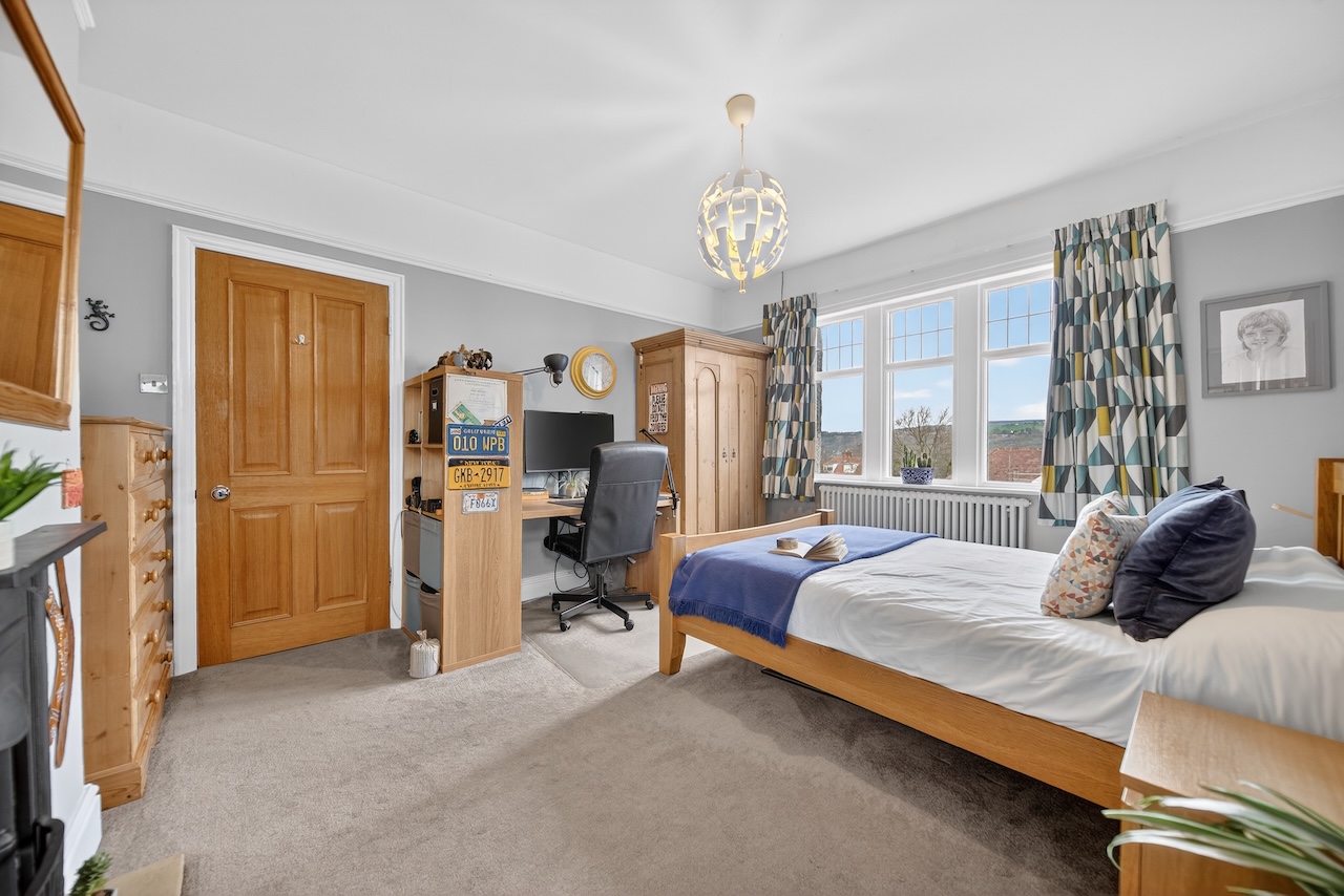 Once the principal bedroom, the largest of the three remaining bedrooms enjoys windows to both front and rear with north facing views across rooftops to Denton Moor and a black cast iron fireplace. Two further rooms sit to the side of the house, each offering a calm atmosphere and flexible use for children, guests or working from home.