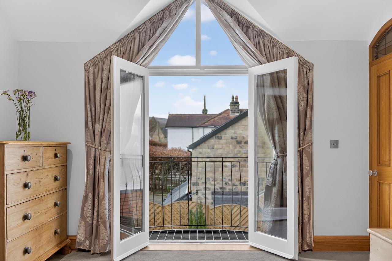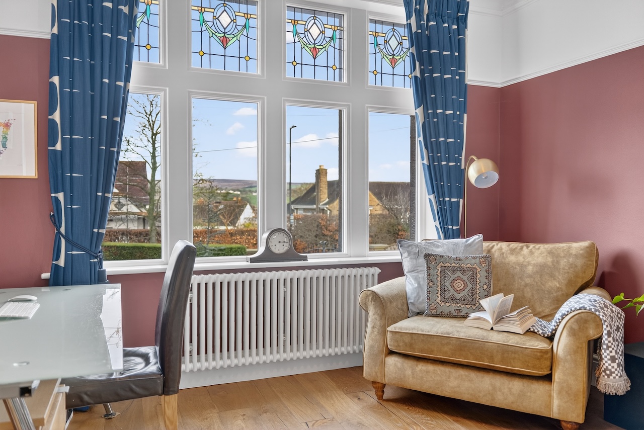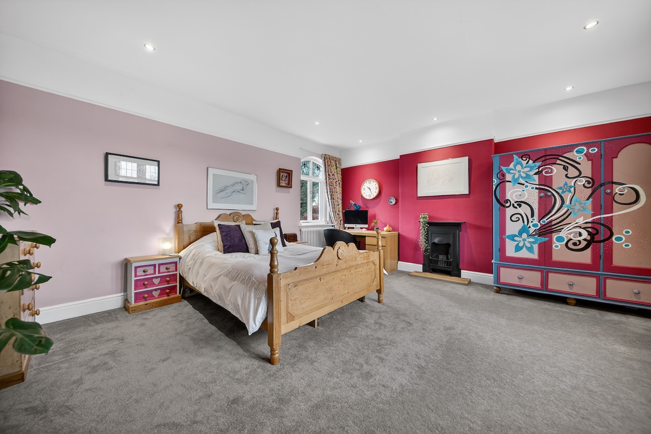 Once the principal bedroom, the largest of the three remaining bedrooms enjoys windows to both front and rear with north facing views across rooftops to Denton Moor and a black cast iron fireplace. Two further rooms sit to the side of the house, each offering a calm atmosphere and flexible use for children, guests or working from home.