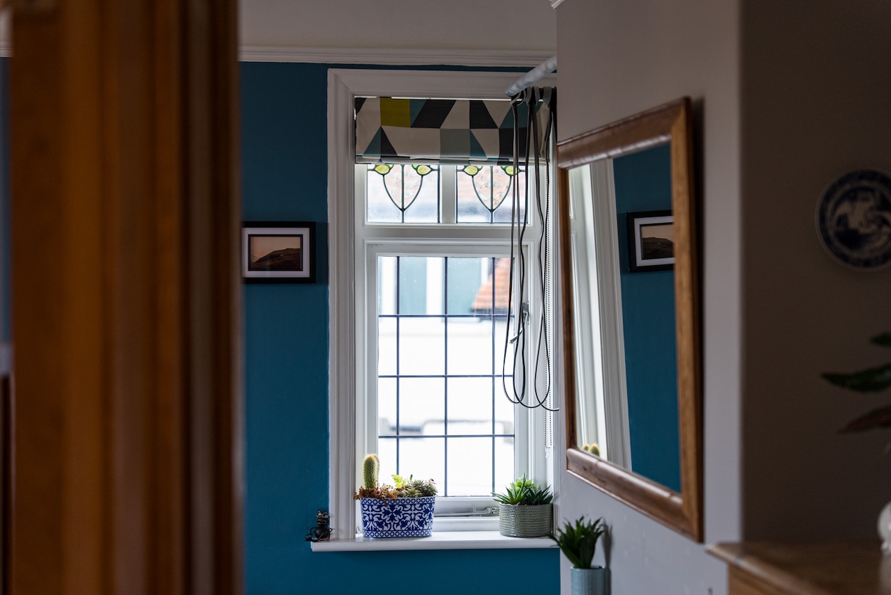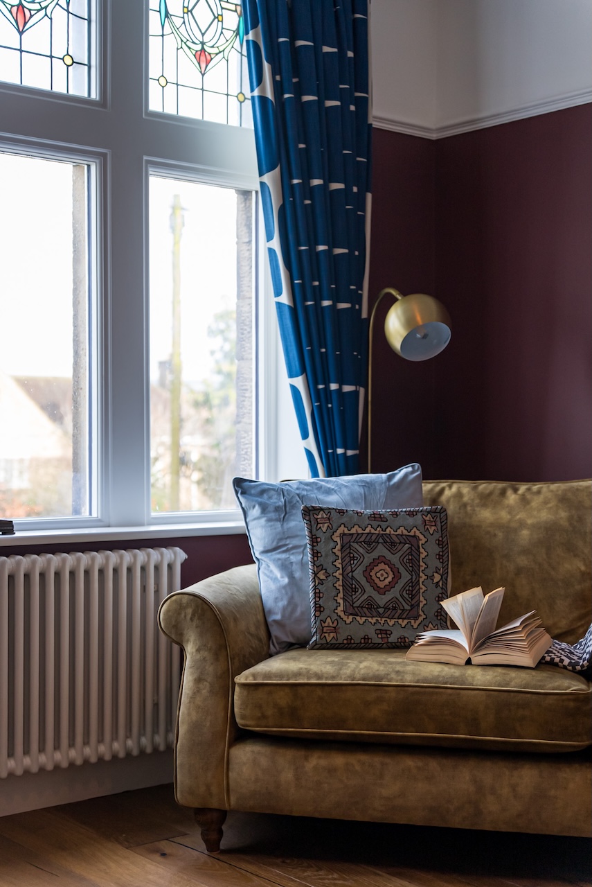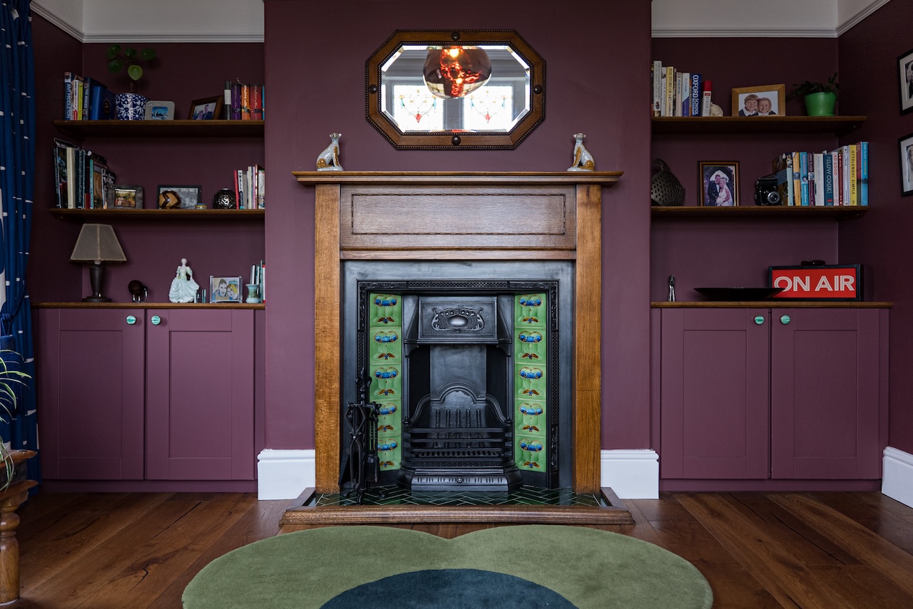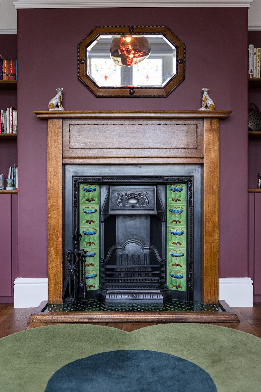 The study is a room people tend to remember. Stained glass windows filter the light throughout the day, casting gentle colour across the space and giving it a calm, uplifting feel. A restored Victorian fireplace with timber surround and original tiled detailing anchors the room, while built-in shelving and cabinetry painted in Little Greene Adventurer provide useful storage without overwhelming the space.