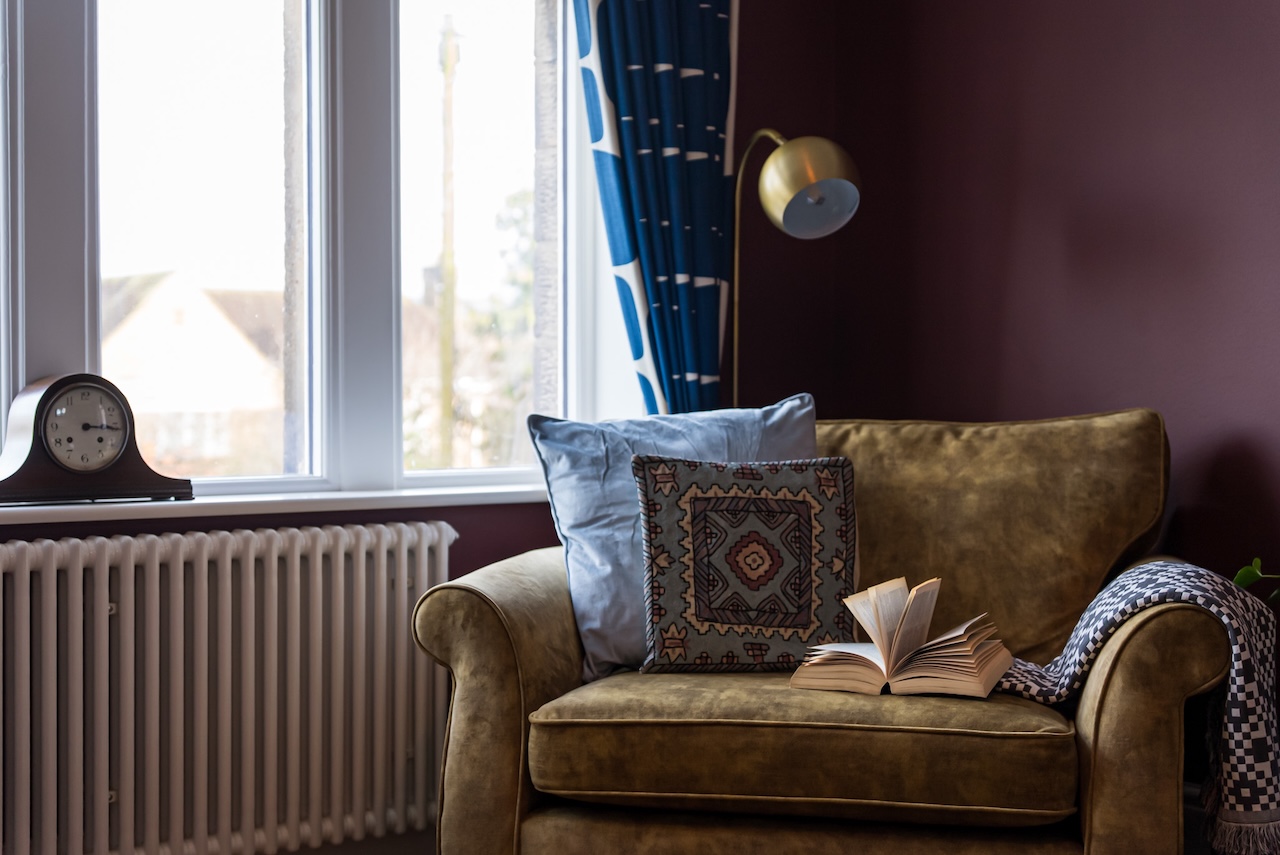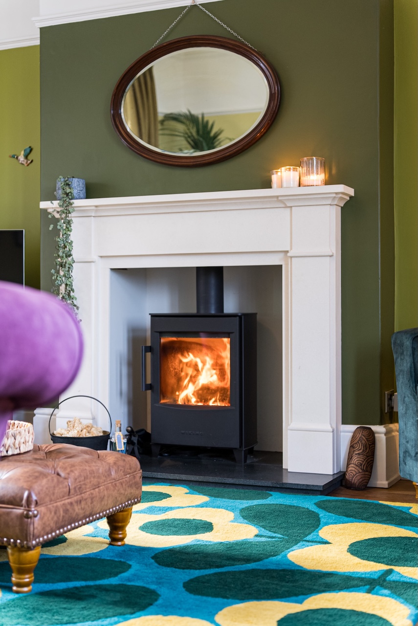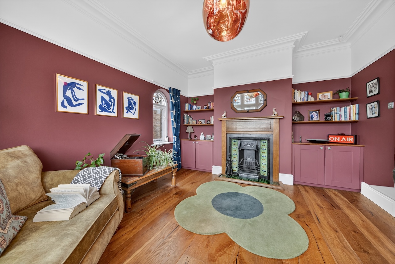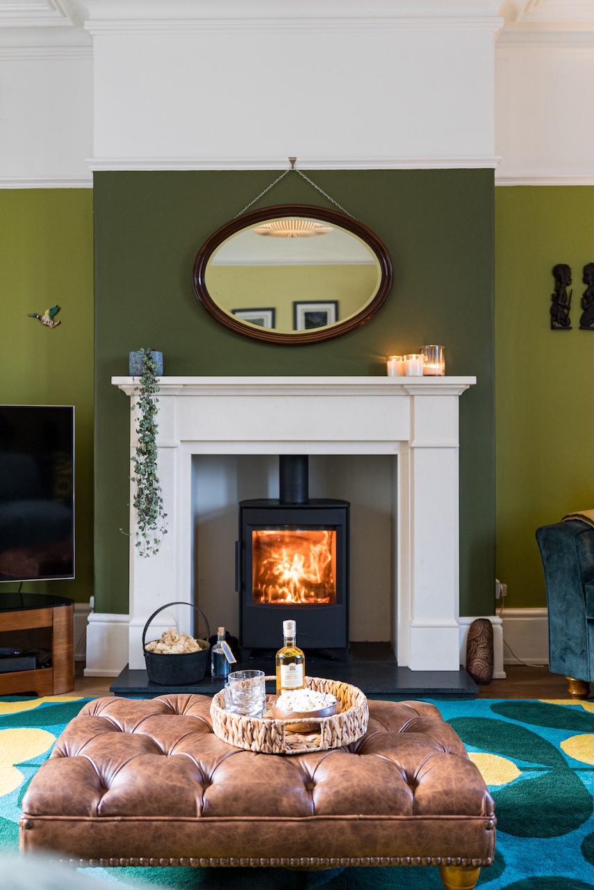 The sitting room feels warm and settled, especially in the afternoon light. A generous bay window looks out to the garden, while deeper wall tones are balanced by crisp cornicing, picture rails and oak flooring. The chimney breast, finished in Little Greene Olive Colour 72, adds depth to the room. At its centre, a fireplace with a log burning stove creates a natural focal point, making this a space that works just as well when the house is busy as it does when it’s quiet.