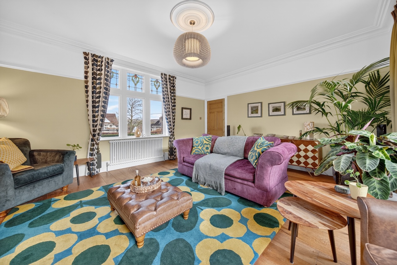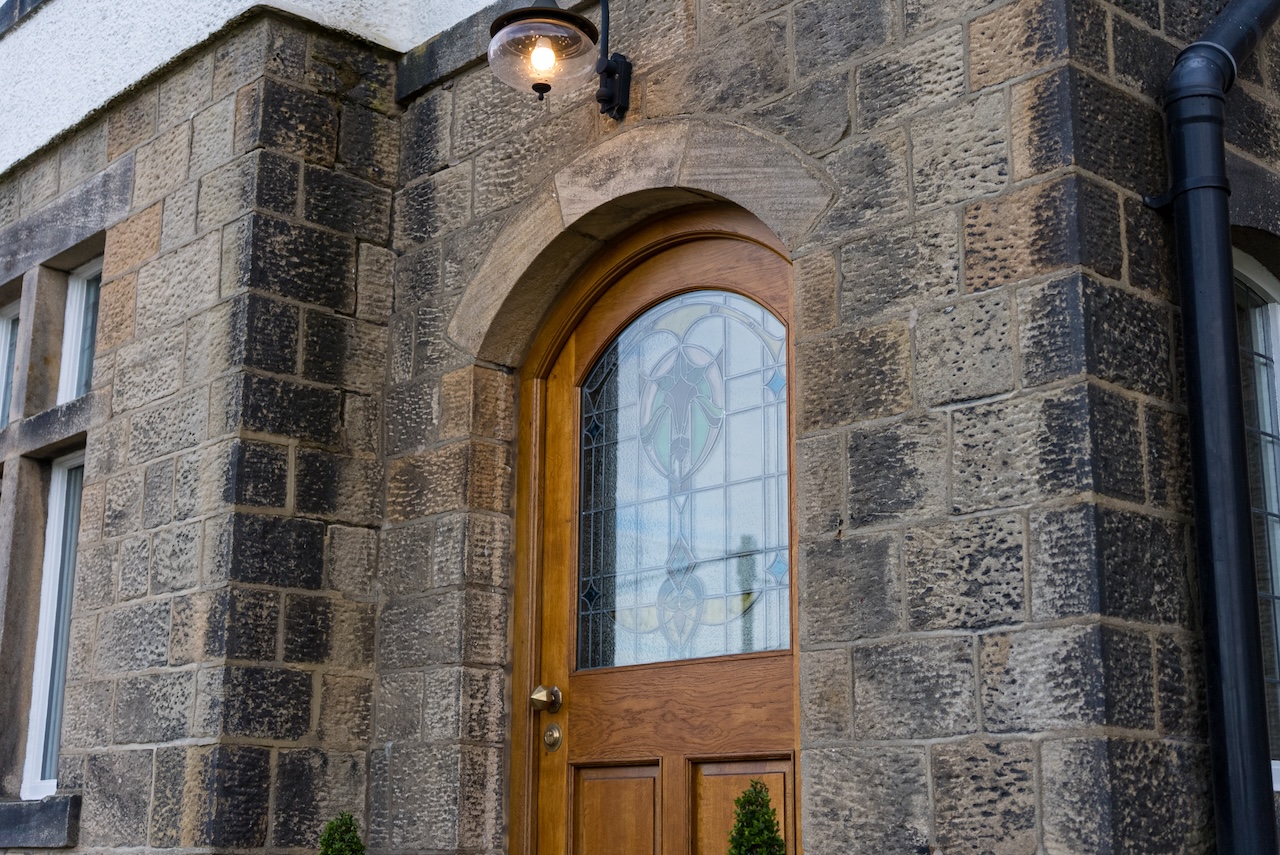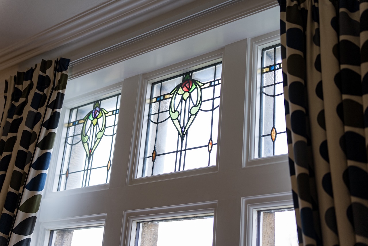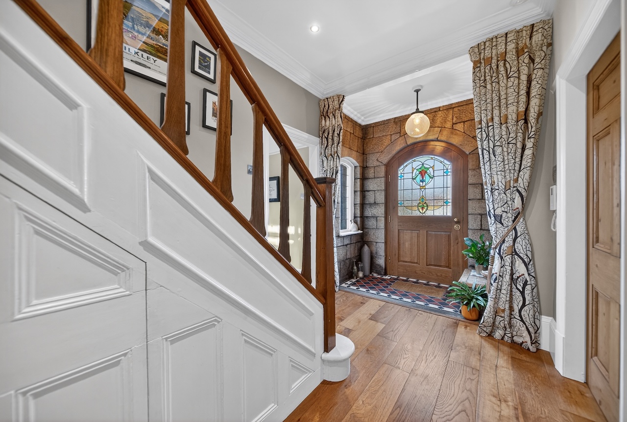 The reception hall gives a good sense of the house straight away; it feels calm and welcoming rather than formal. Stonework framing the arched doorway reflects the home’s history, while the oak front door with original stained glass casts soft patterns of light across the tiled threshold. A globe pendant provides a warm glow overhead and tall windows draw daylight into the space. Engineered oak flooring runs through the hall, with an under-stairs cupboard and a nearby cloakroom with high flush WC adding everyday practicality.