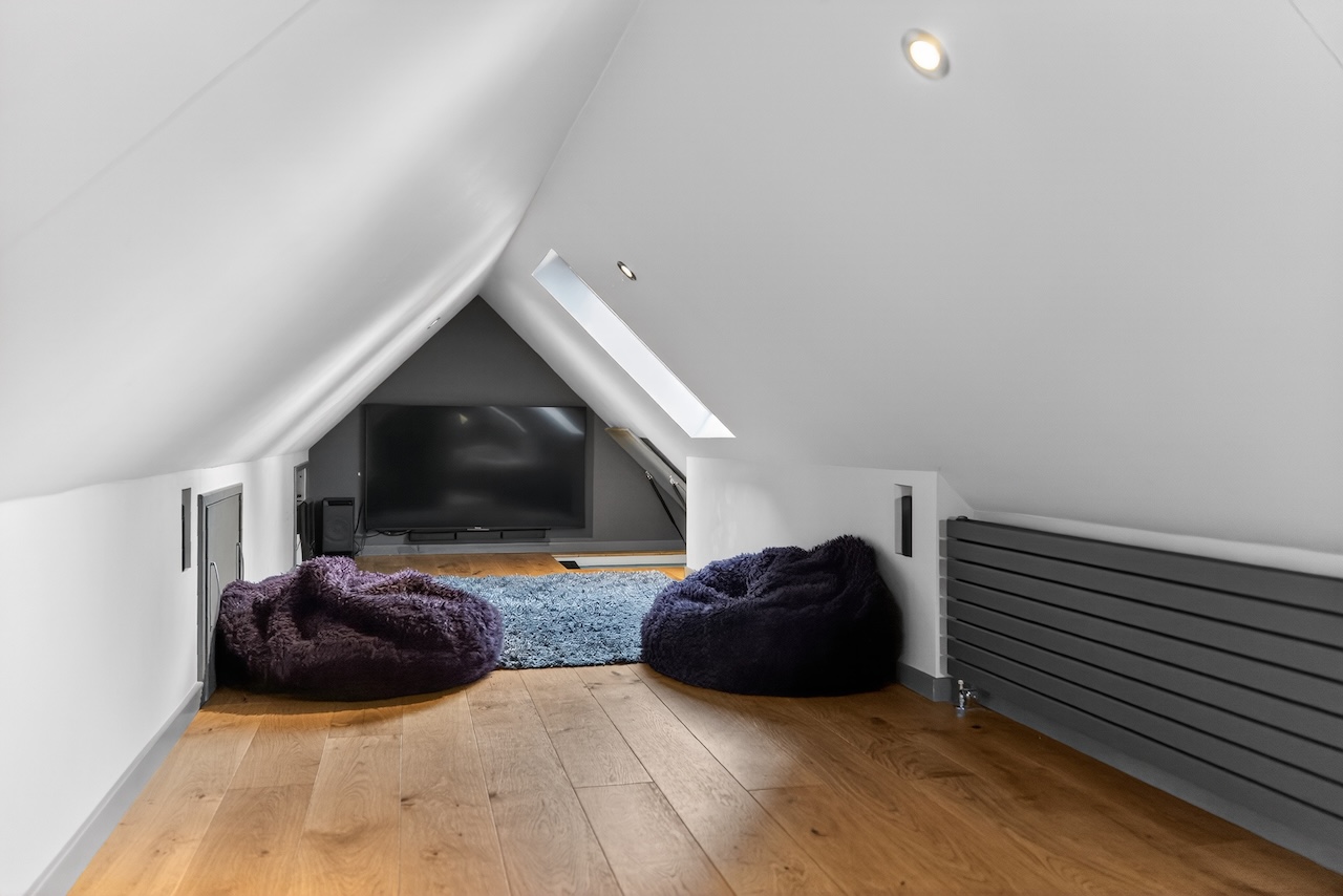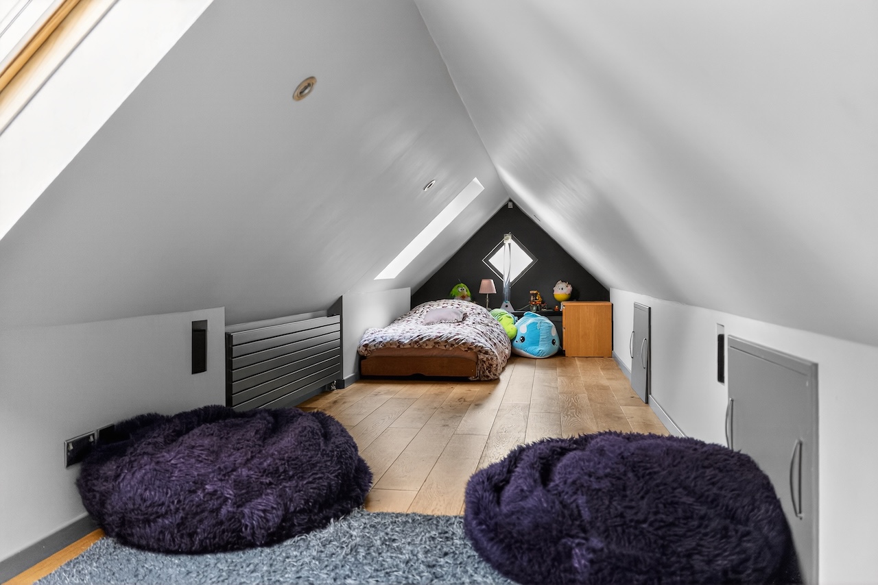 Above, a versatile playroom or den provides valuable additional space set apart from the main living rooms. Natural light pours in through a feature front window and two Velux rooflights, while engineered oak flooring and eaves storage allow the room to adapt as needs change.