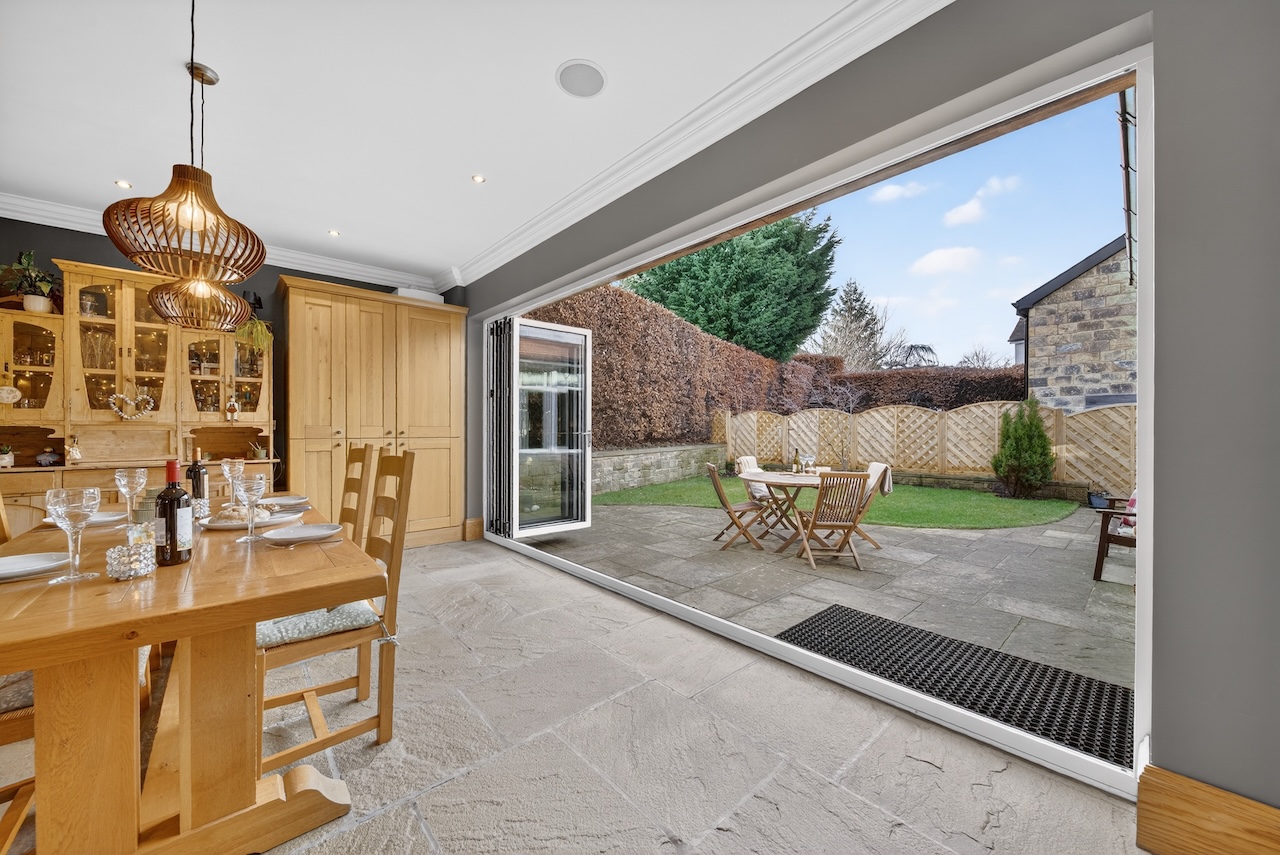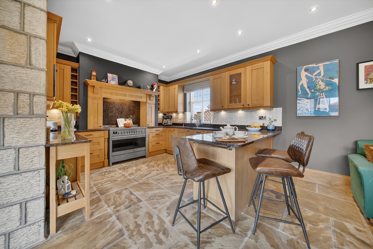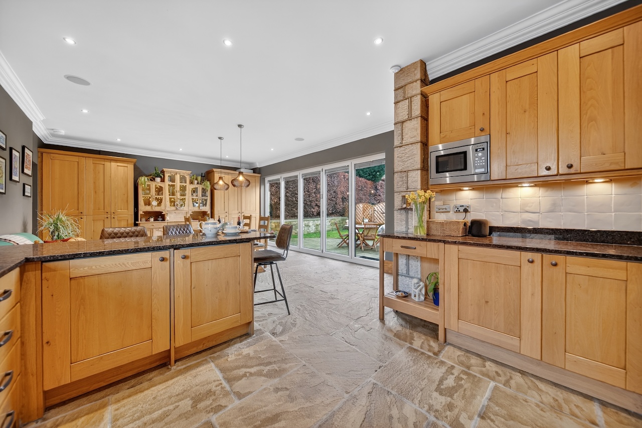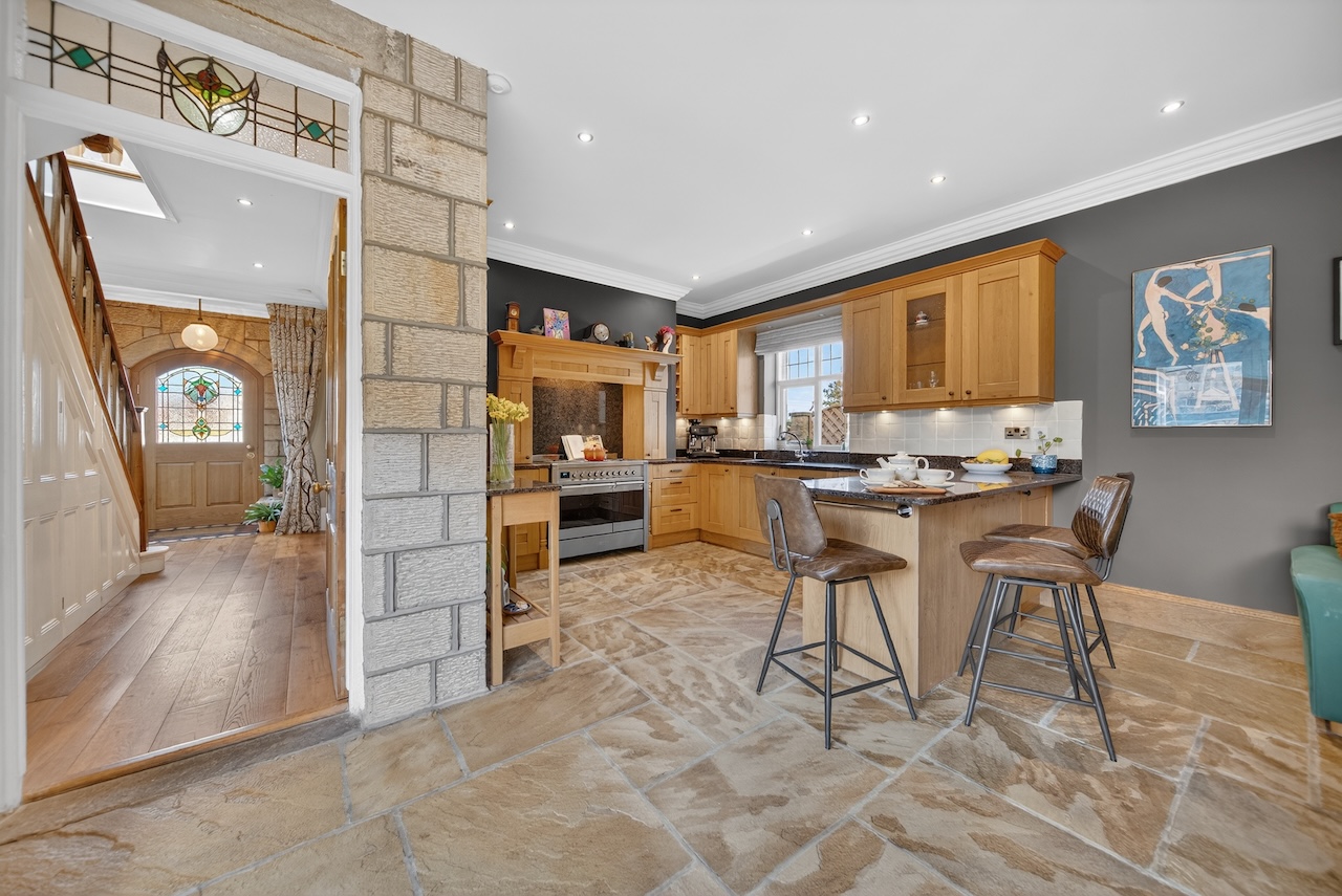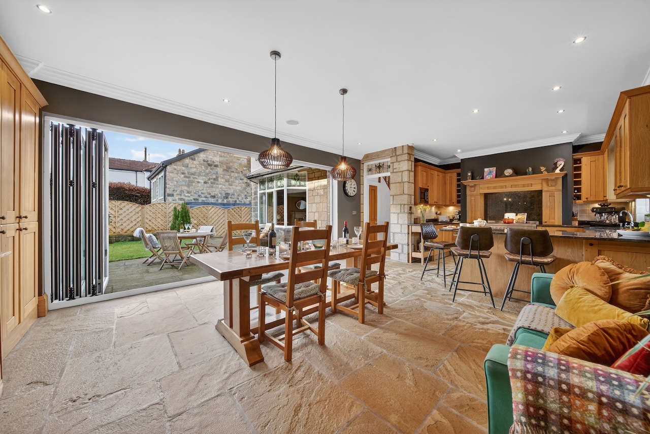 Riven Yorkshire stone flooring runs throughout, with underfloor heating ensuring comfort all year round. A generous island with breakfast bar seating draws people in for coffee, homework or conversation. Everything feels well considered, from the materials to the amount of natural light, with thoughtful lighting and a recessed speaker system allowing the mood to shift easily from day to evening.