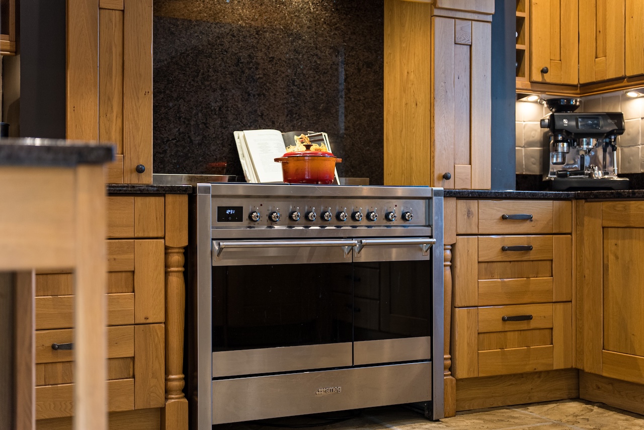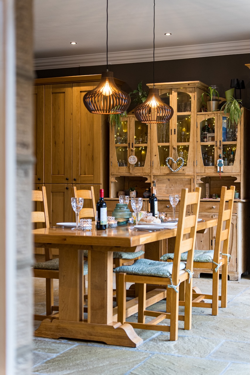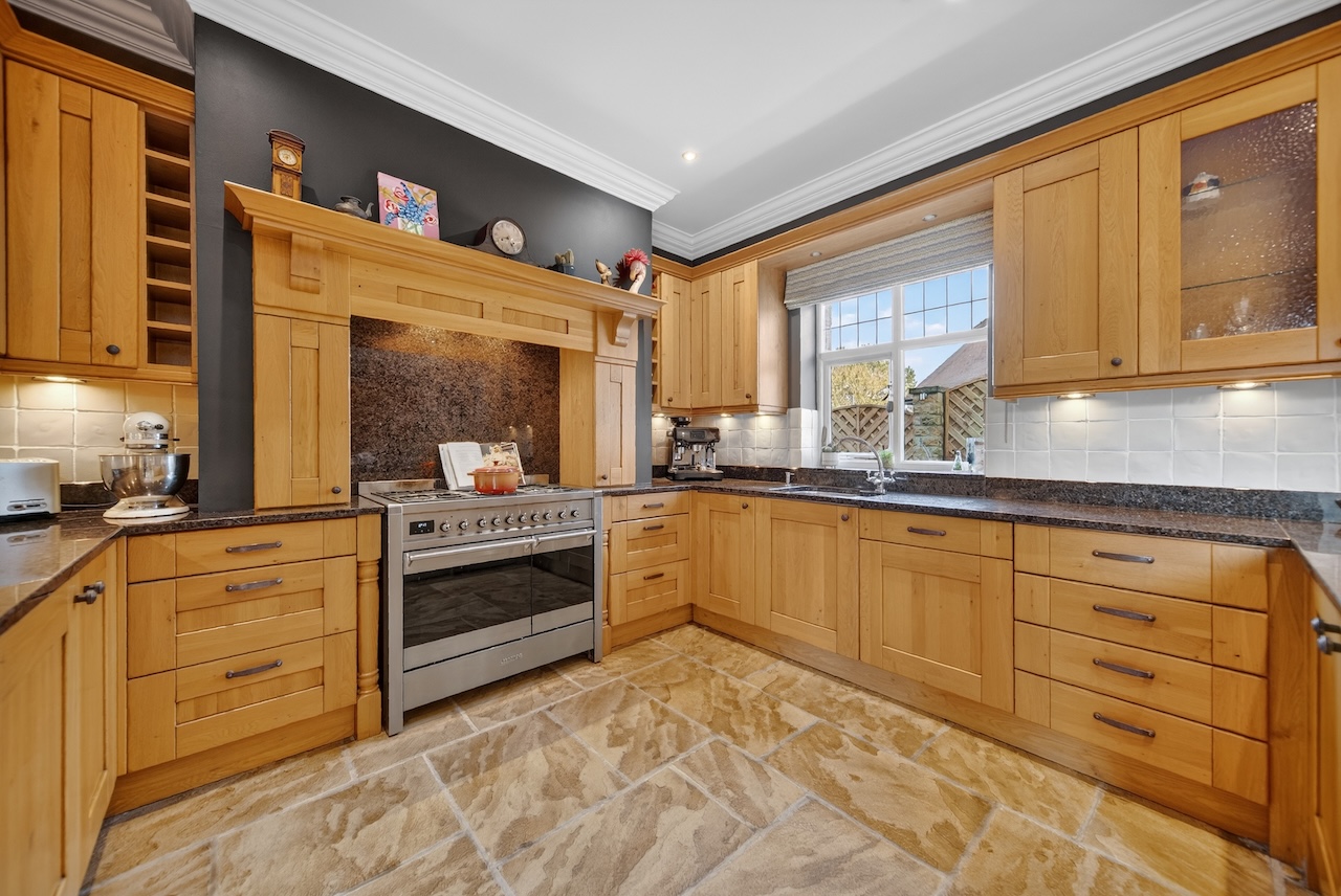 The open plan kitchen diner is where everyone naturally ends up. Used from early mornings through to late evenings, it feels equally suited to everyday life and entertaining. A bespoke Wentworth kitchen anchors the room, with solid oak cabinetry and antique Labrador granite worktops. The Smeg range sits beneath a bespoke oak surround, forming a natural focal point, while integrated appliances are neatly concealed. A Franke Triflow tap provides filtered water on demand.