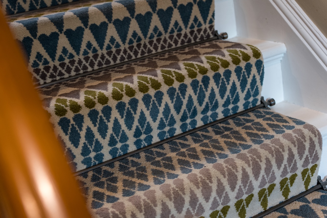 The staircase rises gently to the first floor, softened by a carpet runner that reveals painted wood beneath. A stained glass window brings colour and light to the landing, while a light grey carpet runs throughout, creating continuity.
