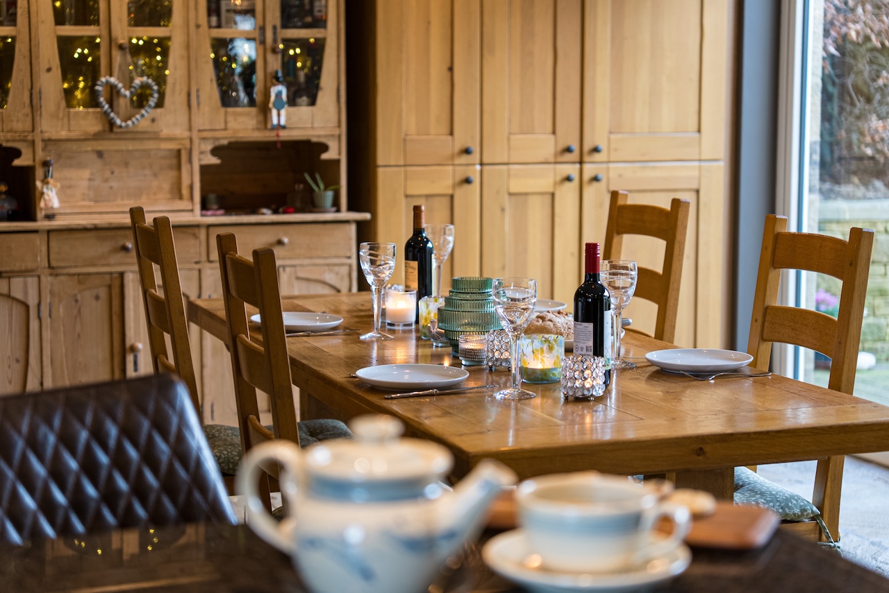 The dining area sits beside the bi-folding doors. When opened, the south facing garden becomes a natural extension of the room, making summer lunches and relaxed gatherings easy.