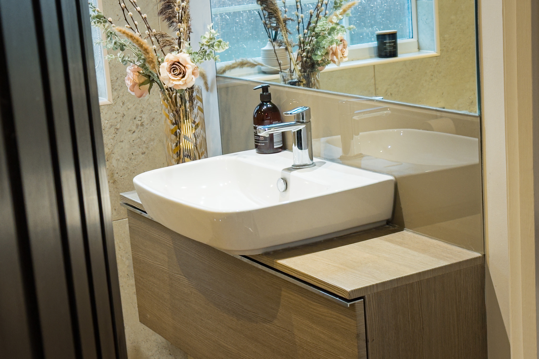 Floor-mounted inset lighting automatically turns on as you enter the en-suite, which has an enormous double shower with a glass screen. There is a WC and the wash hand basin sits atop a vanity unit.