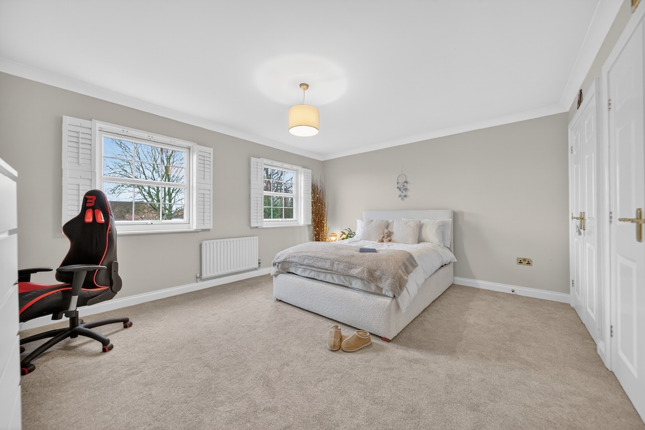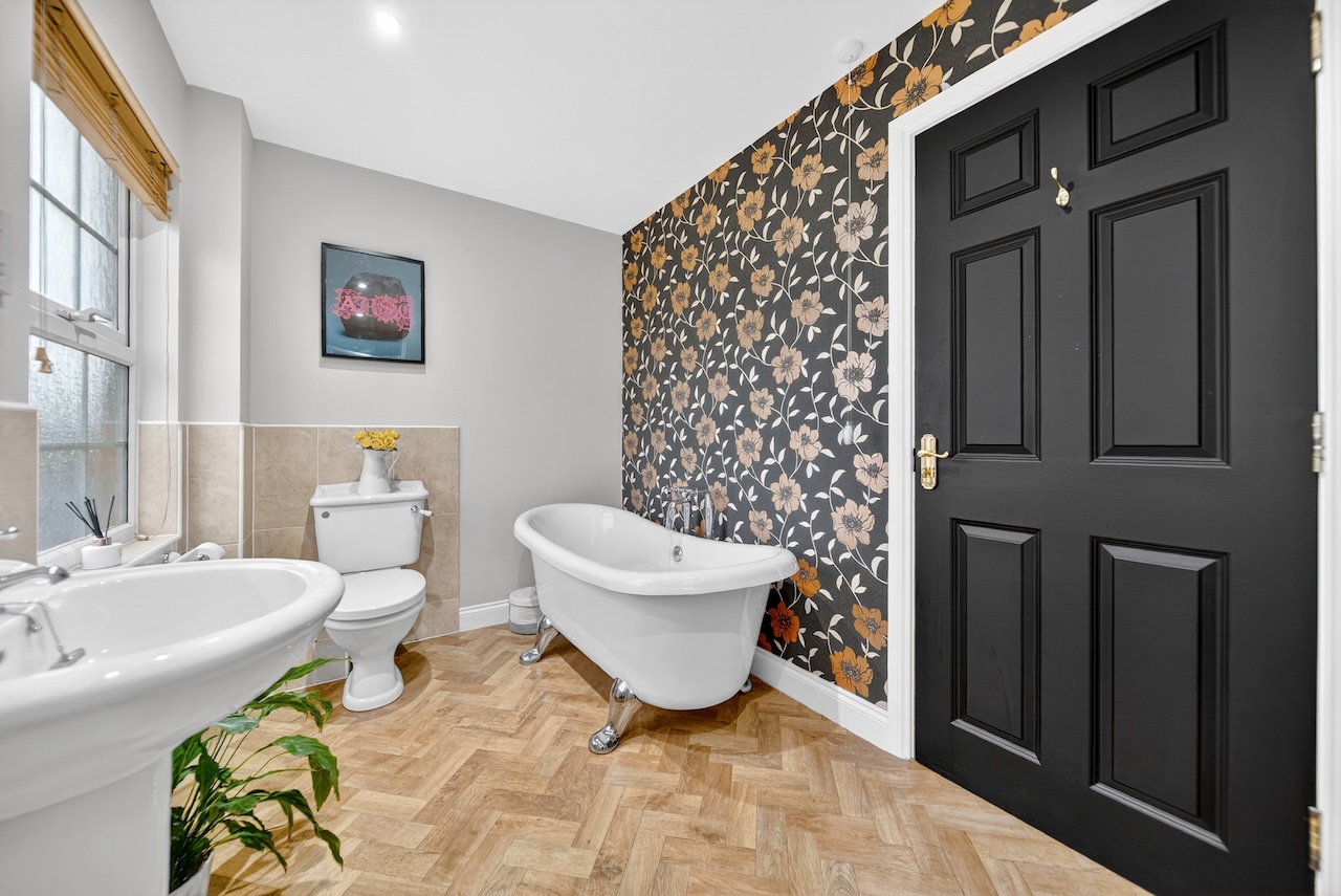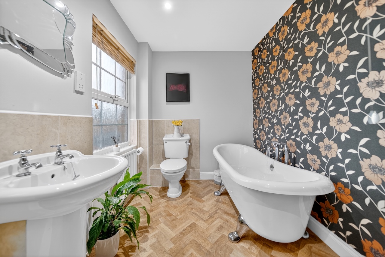 Each of the three remaining double bedrooms have a unique interior design and two windows filling them with natural light. The second bedroom has an en suite shower room, making it a great guest or older child’s room and views of the rear garden. Sharing the same views, the third bedroom has spacious built-in, double wardrobes and is painted in the calming colour of Skimming Stone by Farrow and Ball. And the fourth and final bedroom is painted in a sophisticated deep green with views over the front garden.