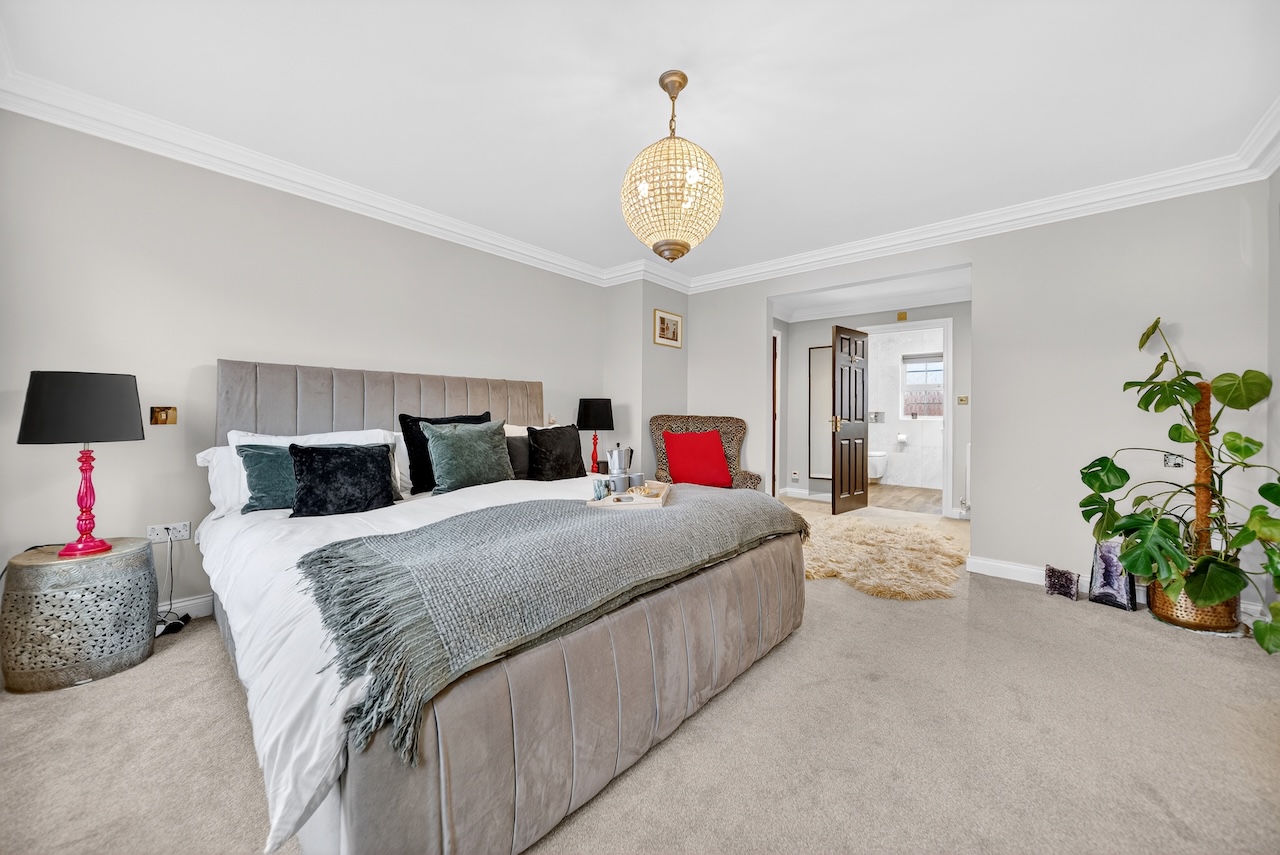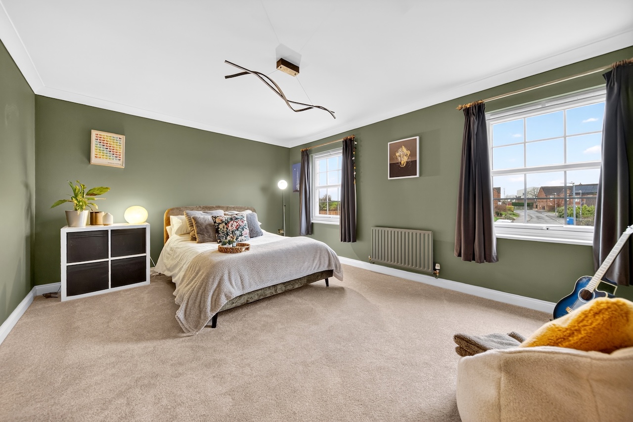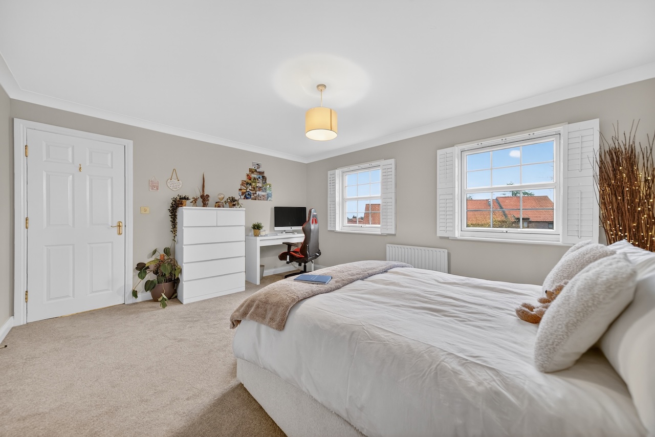 Each of the three remaining double bedrooms have a unique interior design and two windows filling them with natural light. The second bedroom has an en suite shower room, making it a great guest or older child’s room and views of the rear garden. Sharing the same views, the third bedroom has spacious built-in, double wardrobes and is painted in the calming colour of Skimming Stone by Farrow and Ball. And the fourth and final bedroom is painted in a sophisticated deep green with views over the front garden.