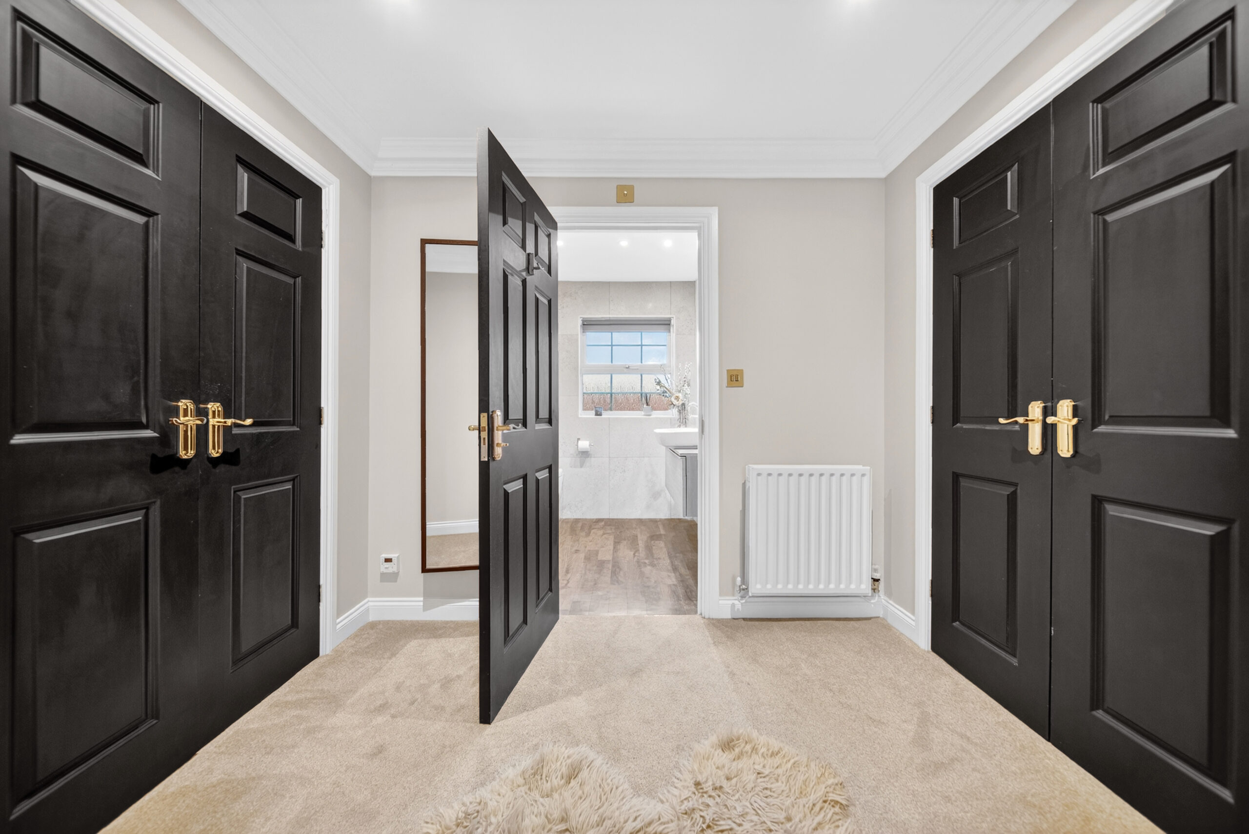 As you reach the first floor, you are greeted by an open landing area with doors leading to the four large bedrooms.