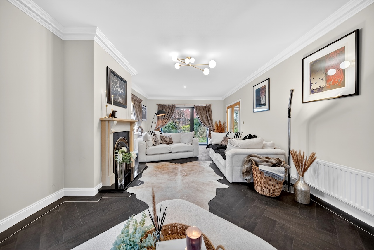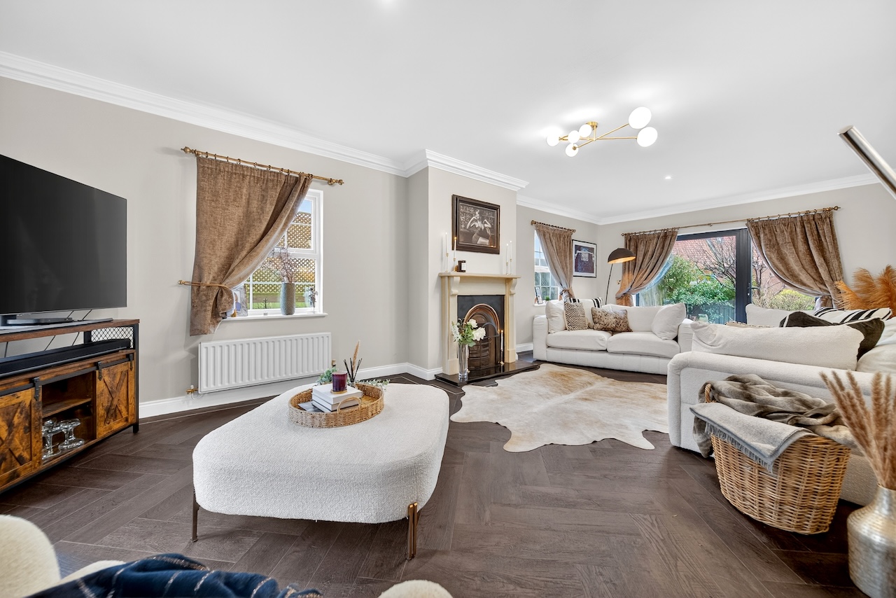 Glazed double doors lead from the hallway into the spacious living room which has windows on three sides offering a panoramic view of the gardens. An open fire provides a natural and warm focal point to the room, and a charcoal grey herringbone floor gives the space a sleek modern look. The large window and door at the rear of the room provide direct access to the gardens.