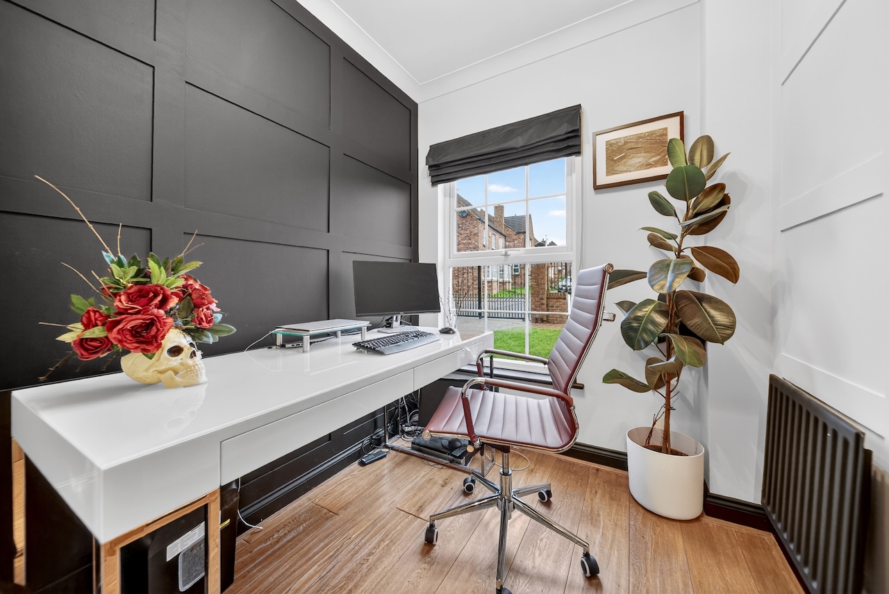 The study offers a quiet place to focus, well suited to working from home or taking calls, with views across the front garden lending a calm backdrop to the day.