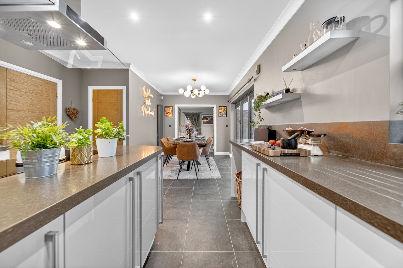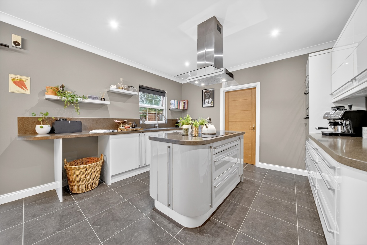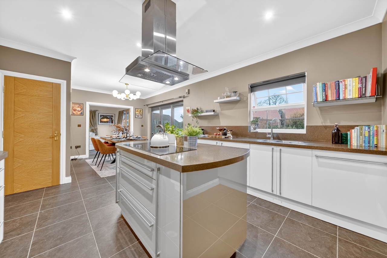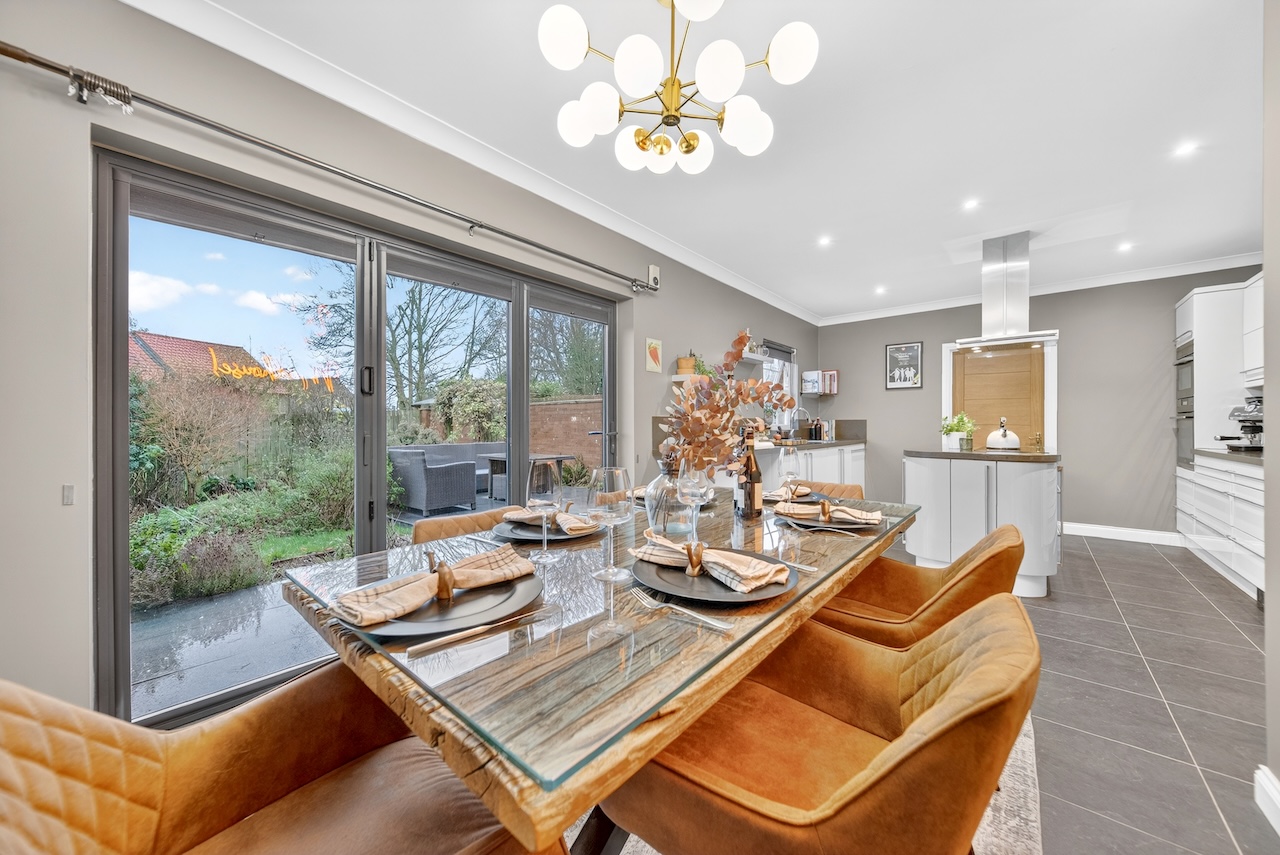 Double doors lead from the living room into the open-plan dining area and kitchen, with plenty of room for a dining table to seat the whole family and bi-fold doors that open fully, creating a seamless connection with the gardens and the porcelain patio area that provides a great spot for al fresco dining. This is an immensely social home and is fantastic for hosting parties.