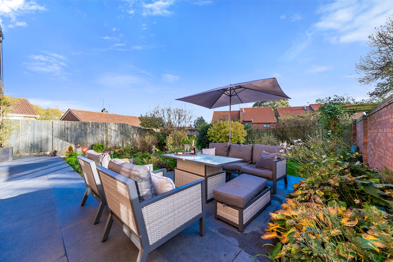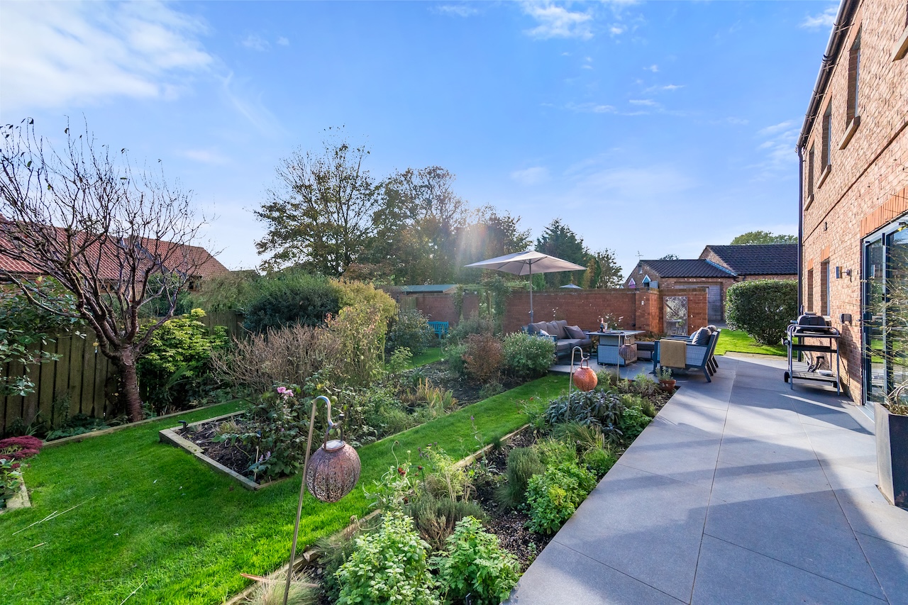 At the rear of the home is a secluded landscaped garden with a porcelain patio. The herb garden is ready to snip whichever herbs your recipe calls for. The flowerbeds are planted in such a way as to ensure colourful blooms throughout the year. Delphiniums and lupins rise tall to give a floral scent on the summer breeze, as well as roses, established shrubs and a fabulous copper-glow prunus. At dusk, the automatic garden lights create a magical space to while away the evening.
