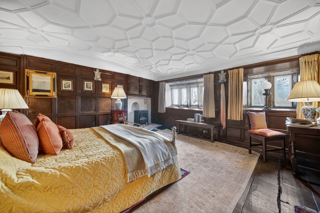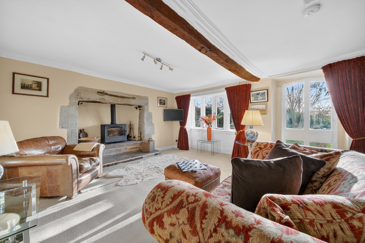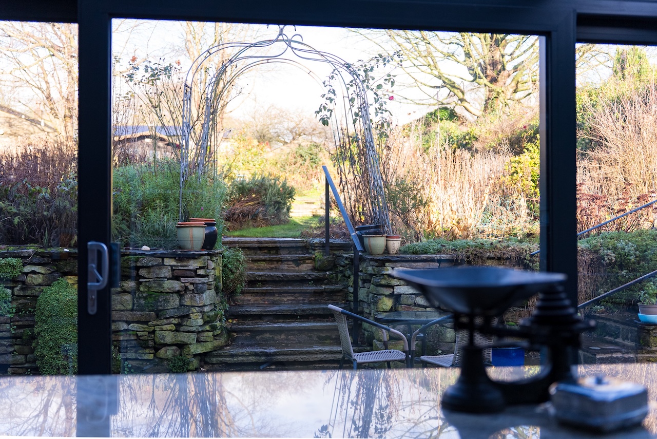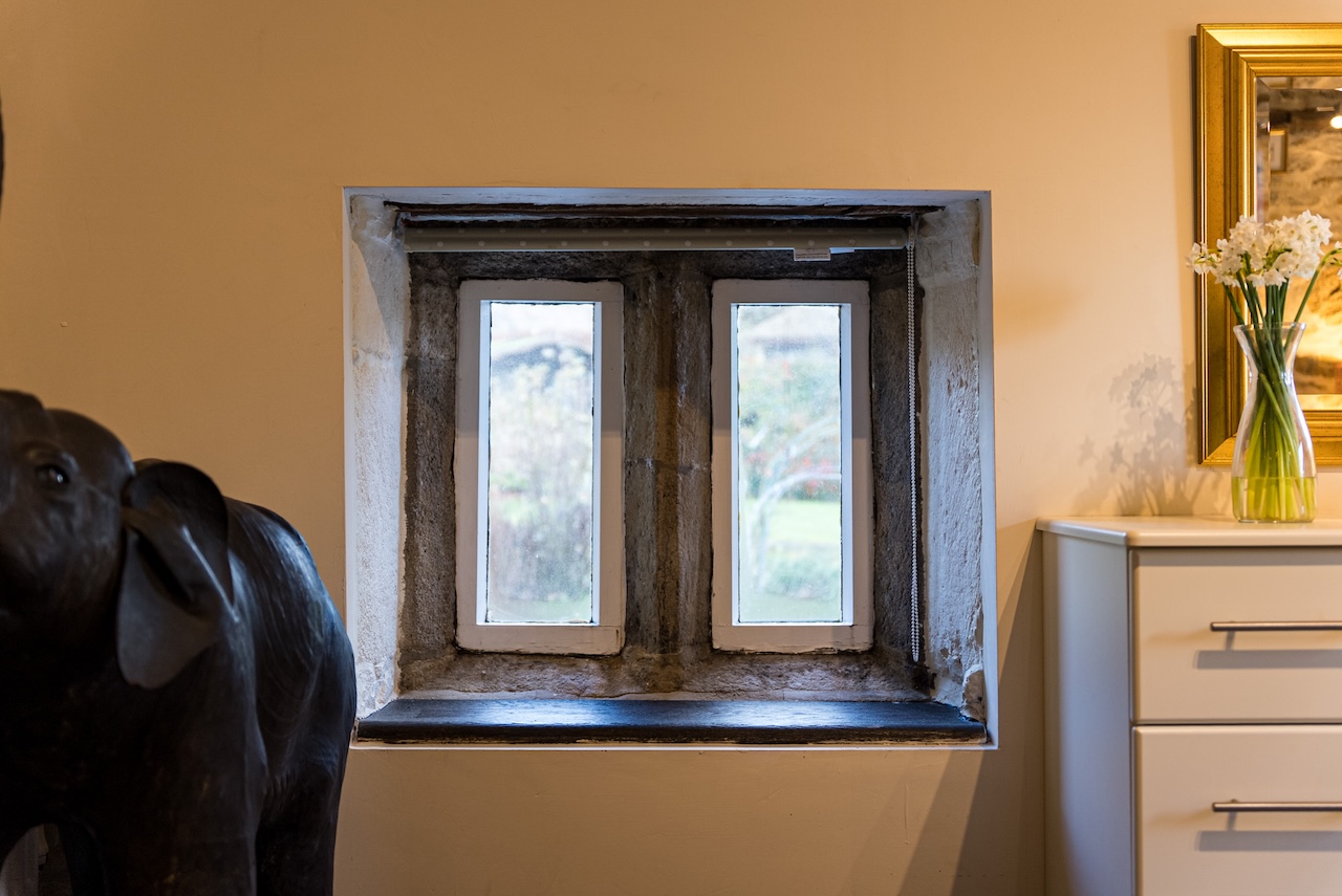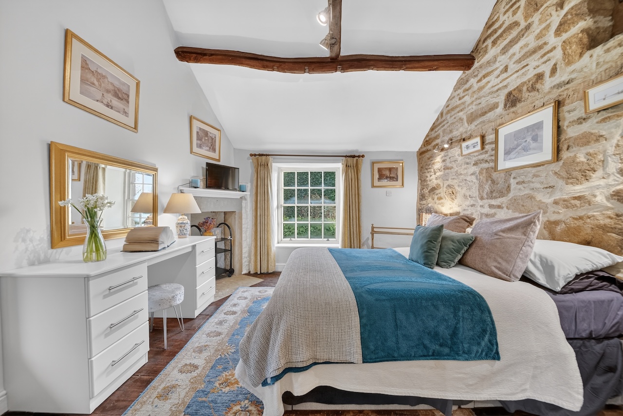 A timber gate opens to a sweeping driveway where the landscape stretches out below the home and sunlight warms the south-facing stone. Birdsong settles across the hillside and the sense of arrival feels deeply rooted in place.