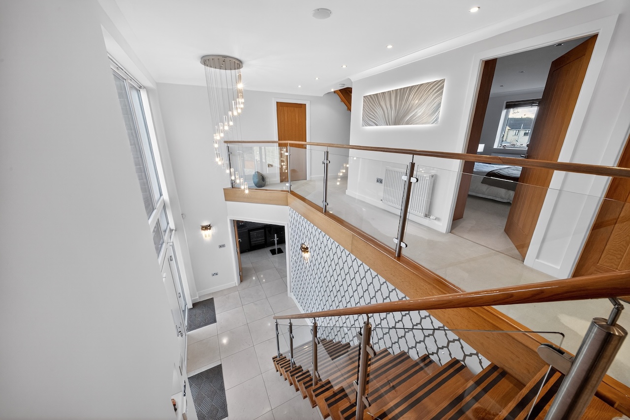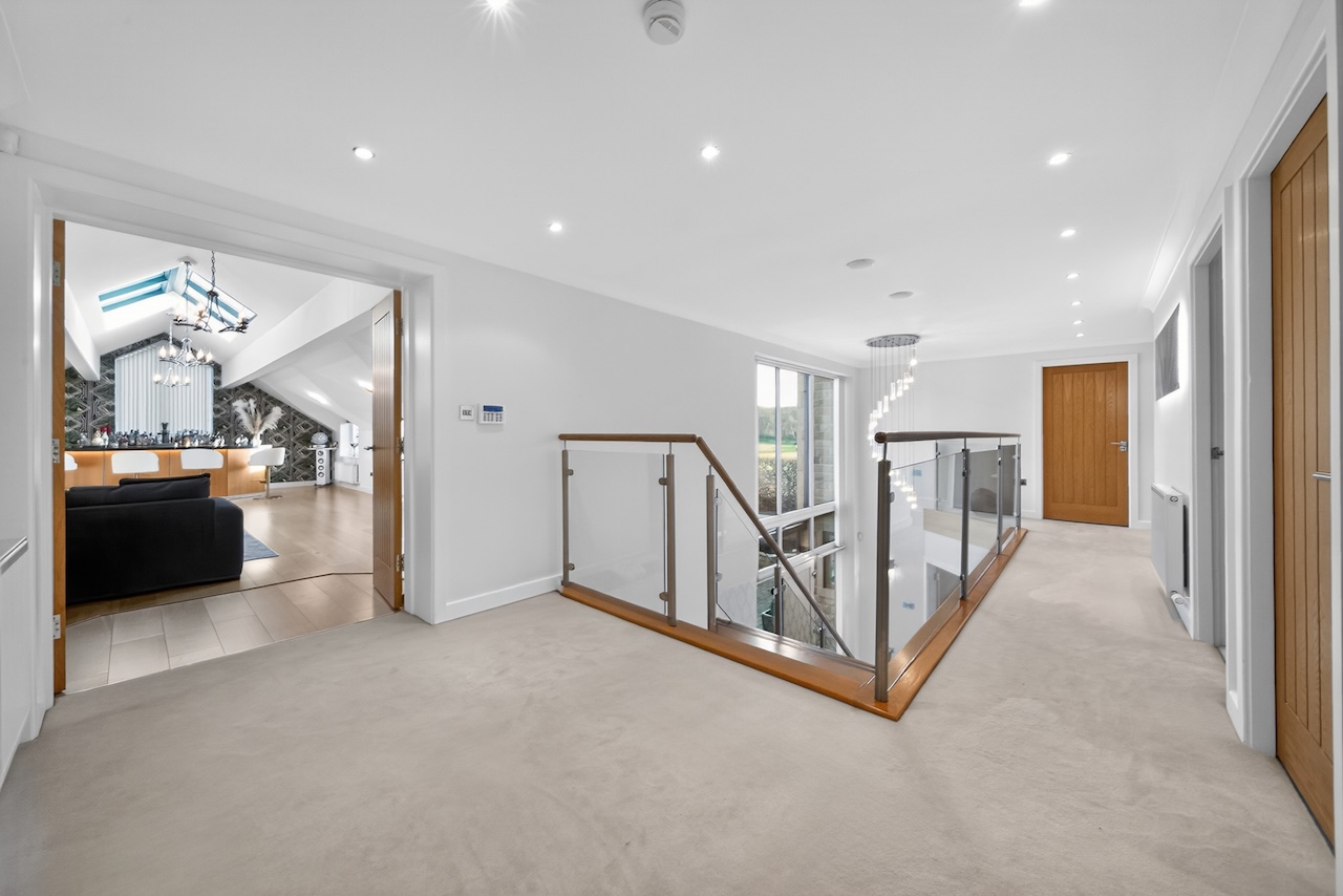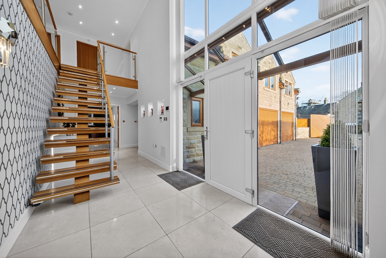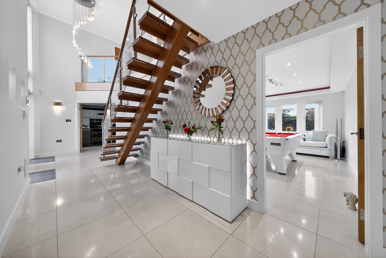There is a sense of home when you arrive at Southgate Court. Generous grounds sit behind electric gates which glide open to a sweeping brick driveway. To the right, the triple garage stands ready to greet you upon your return and houses a useful EV charger. Through the front door, which is surrounded by double height windows, the grand entrance hall is flooded with sunlight. A gentle warmth from underfloor heating welcomes you home, setting the tone for what’s ahead.