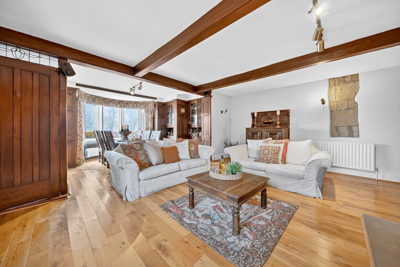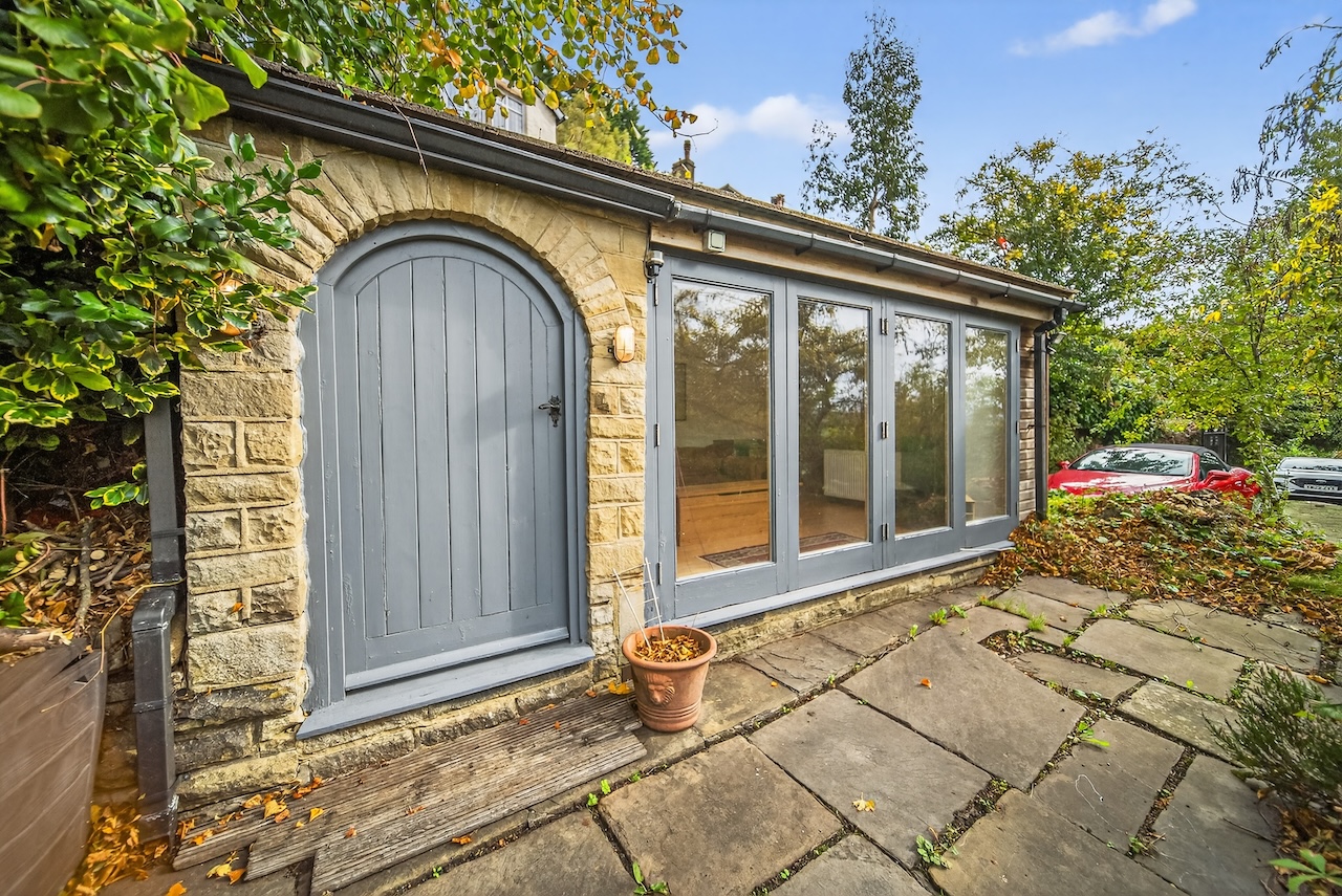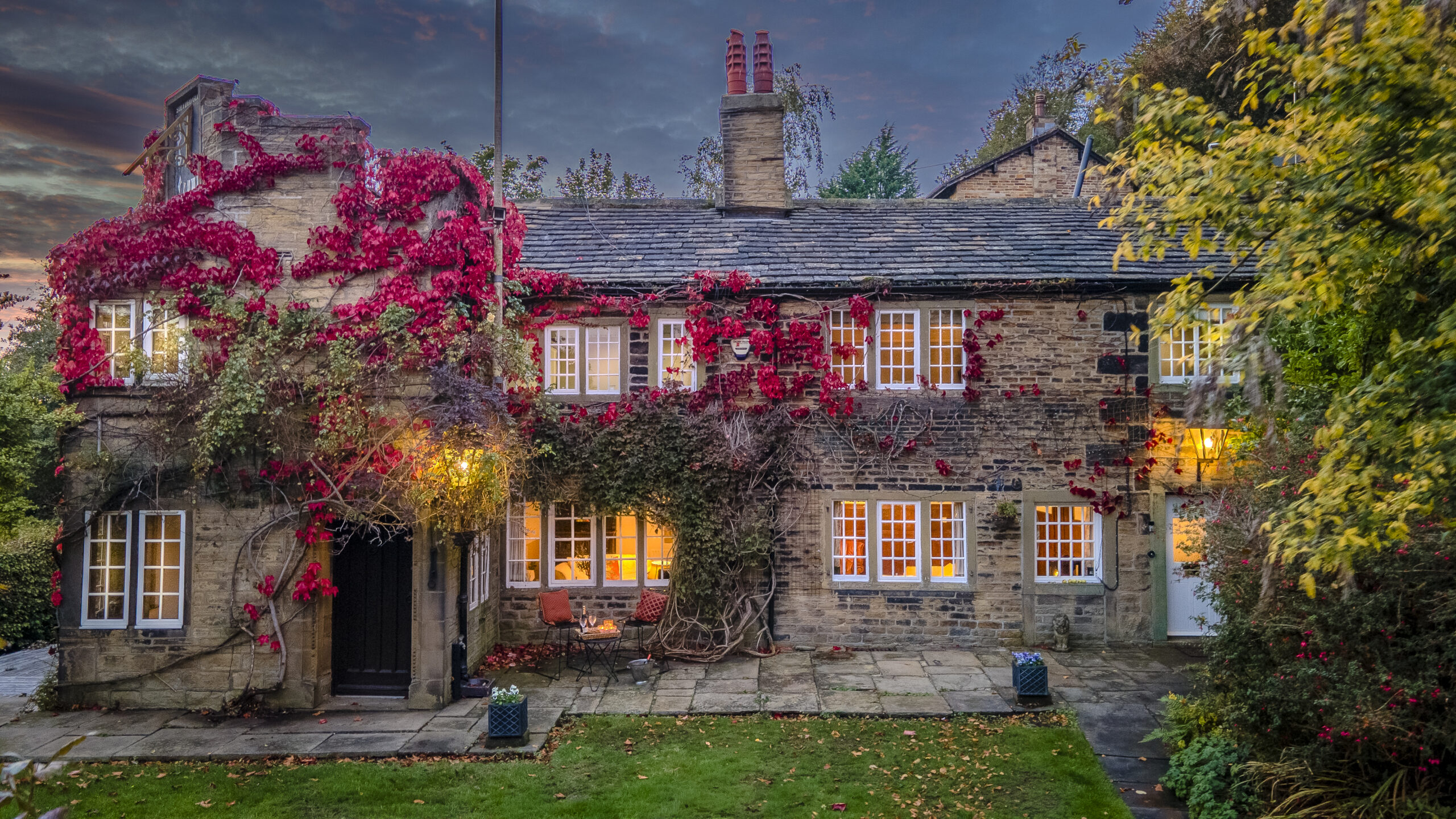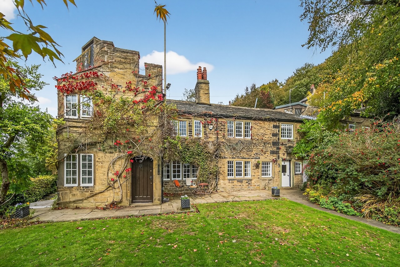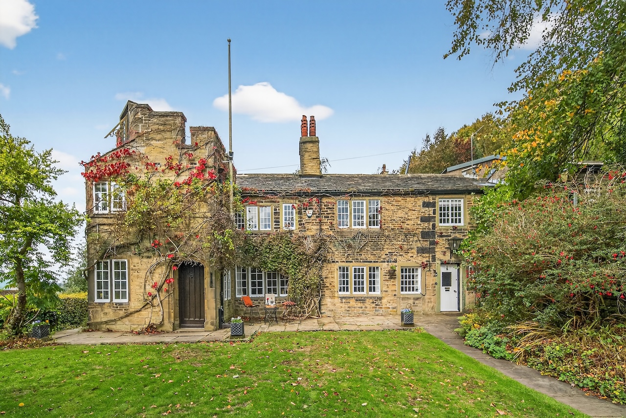 Set behind wrought-iron gates on Trimmingham Lane, The Cottage makes an immediate impression with its cobbled driveway and stone paths leading to the home. The stone frontage, partly wrapped in deep-red autumn vines, brings a sense of history, while the castellated corner with its sundial and flagpole adds a distinctive architectural touch. A stone terrace and lawn extend across the front, creating a natural moment of pause before entering. From this elevated position the views reach across the Halifax valley, with Wainhouse Tower rising through the trees. The proportions and materials give the home a reassuring sense of privacy, character and place.