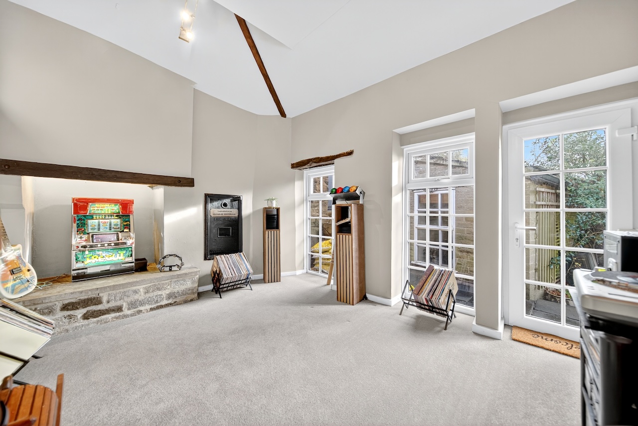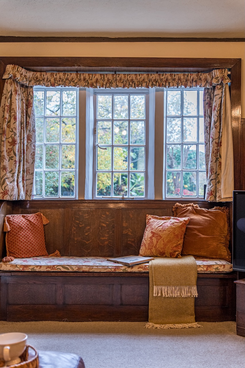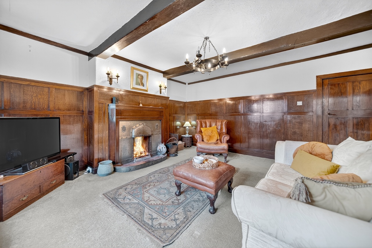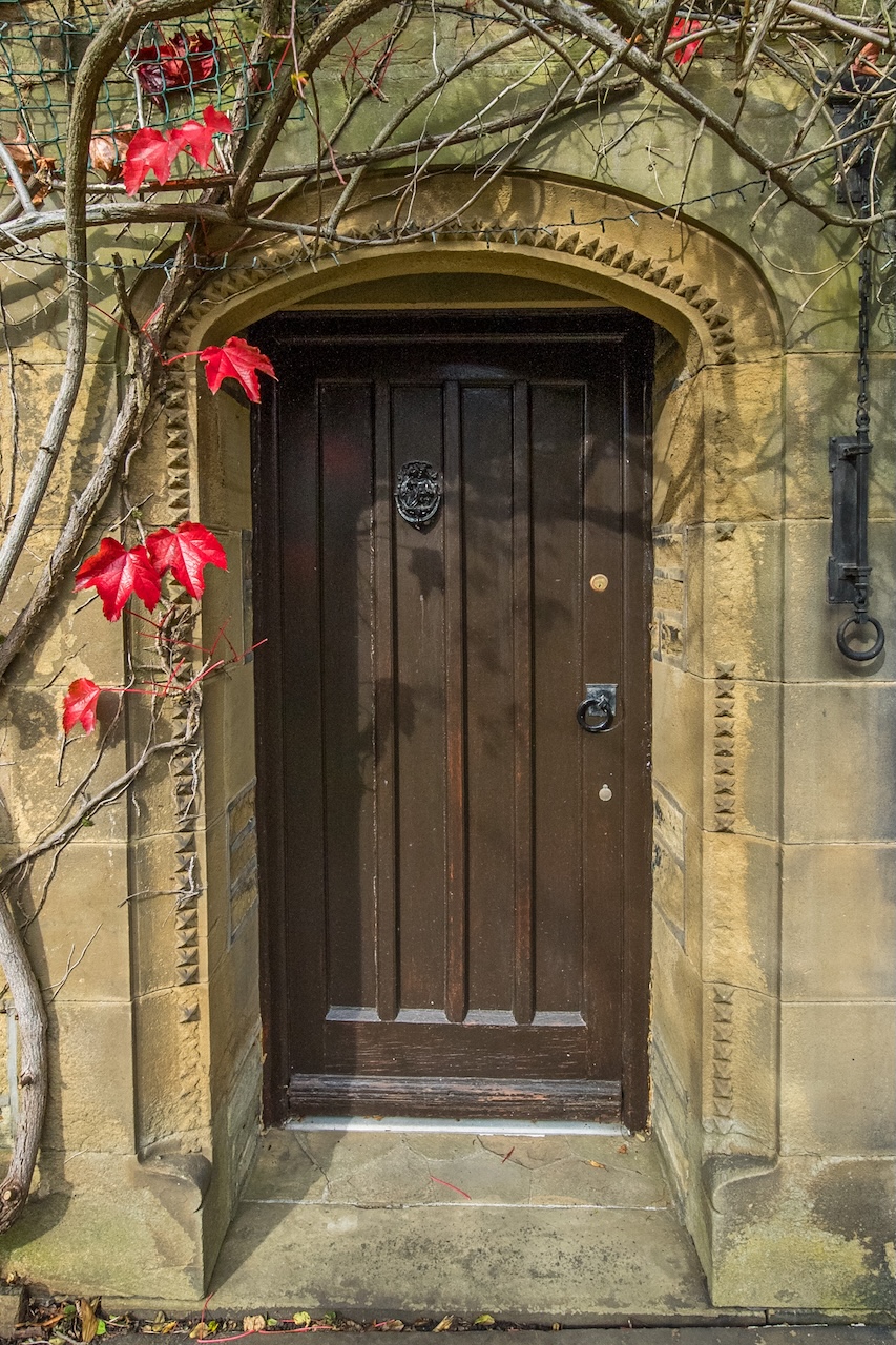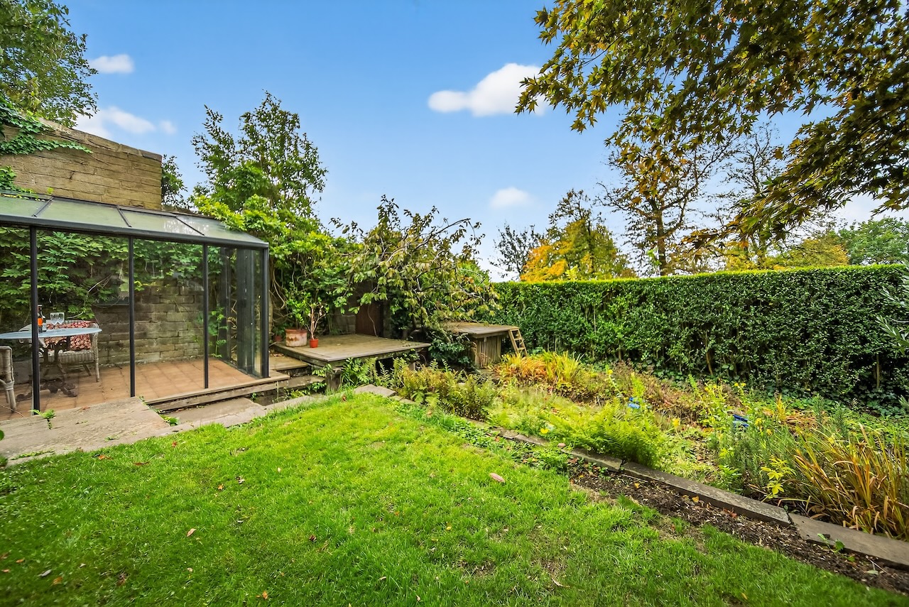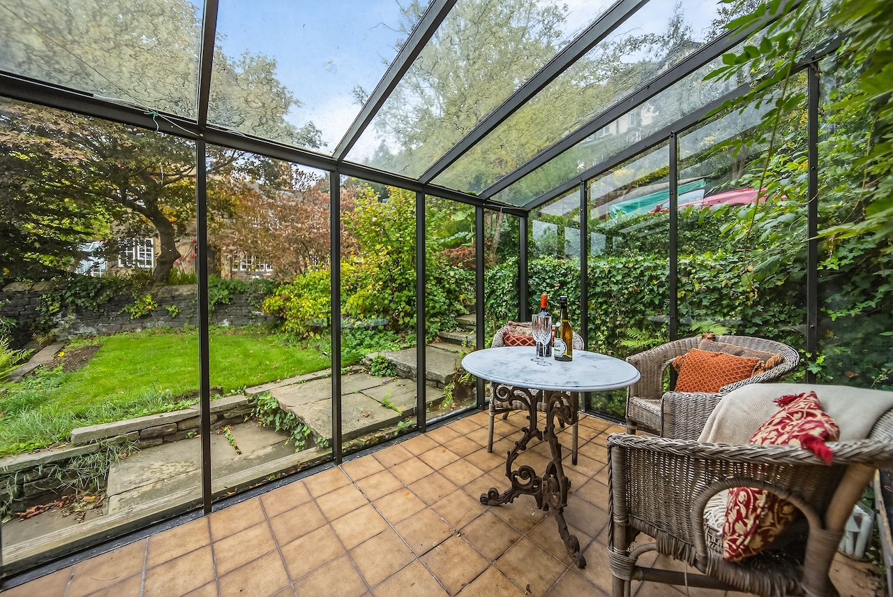 Set behind wrought-iron gates on Trimmingham Lane, The Cottage makes an immediate impression with its cobbled driveway and stone paths leading to the home. The stone frontage, partly wrapped in deep-red autumn vines, brings a sense of history, while the castellated corner with its sundial and flagpole adds a distinctive architectural touch. A stone terrace and lawn extend across the front, creating a natural moment of pause before entering. From this elevated position the views reach across the Halifax valley, with Wainhouse Tower rising through the trees. The proportions and materials give the home a reassuring sense of privacy, character and place.
