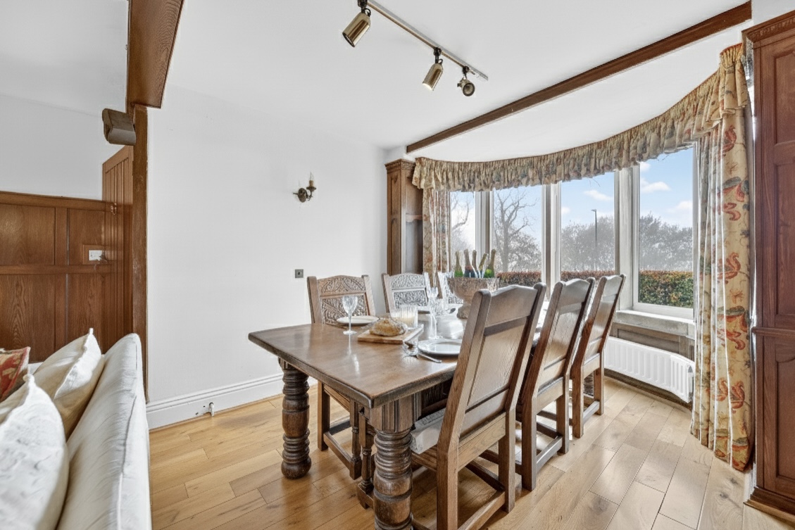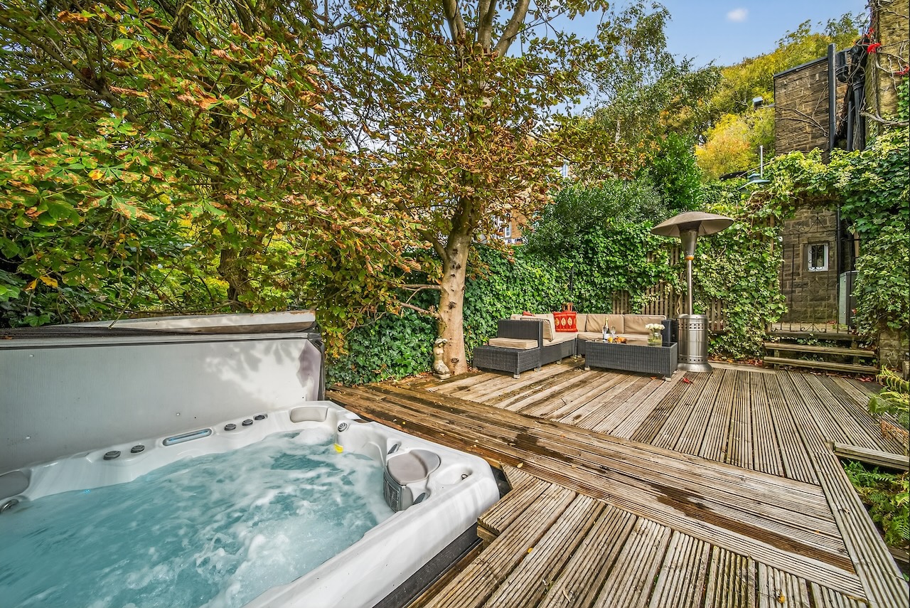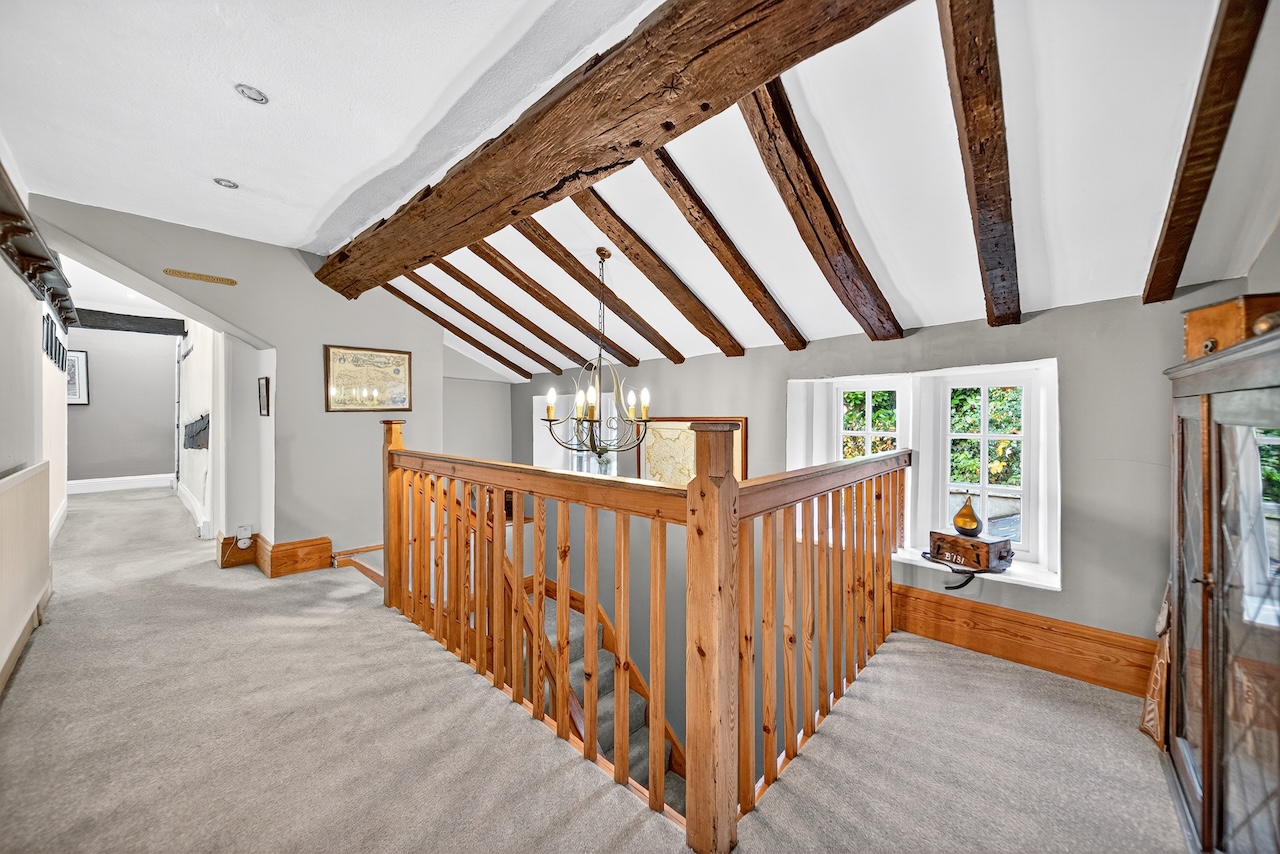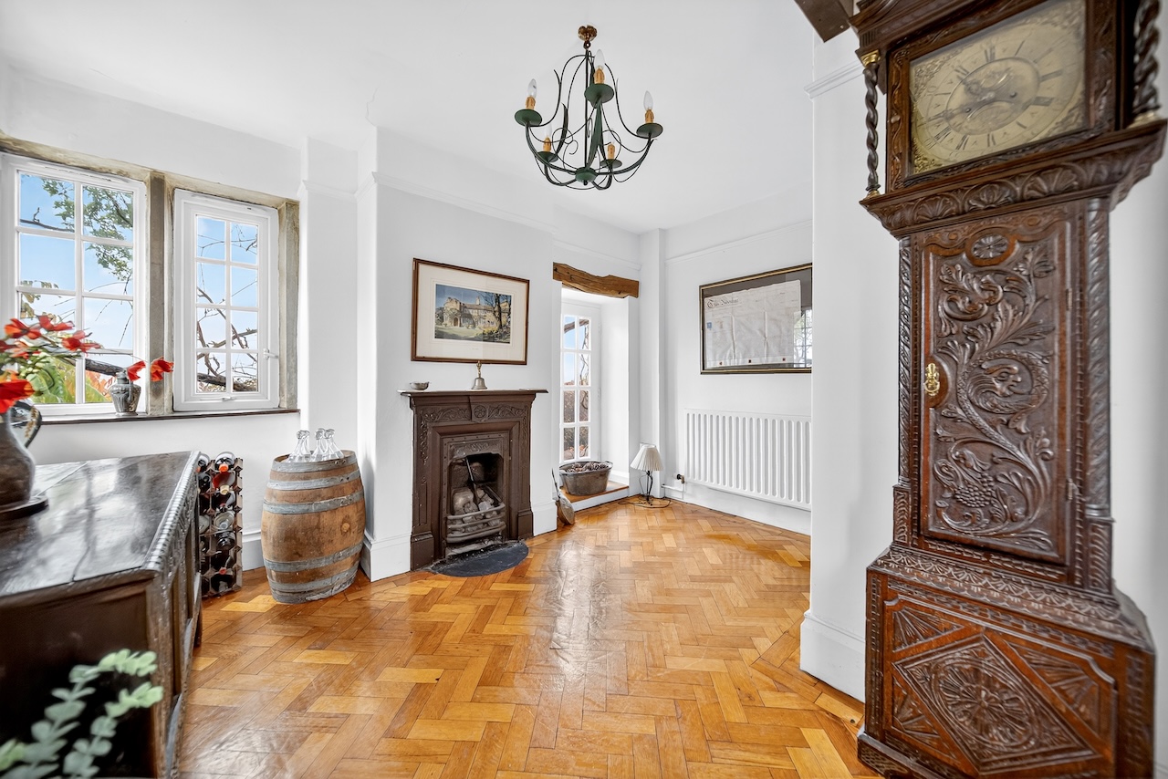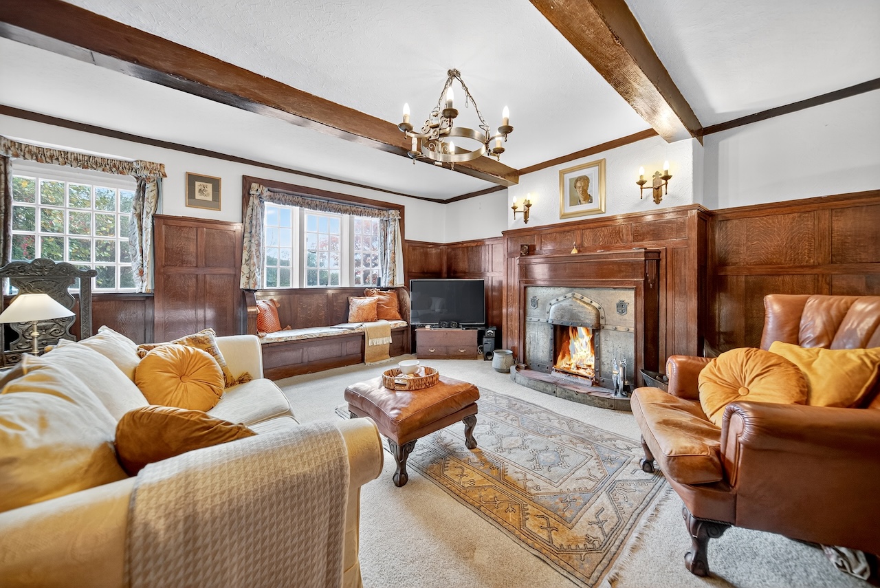 Set behind wrought-iron gates on Trimmingham Lane, The Cottage makes an immediate impression with its cobbled driveway and stone paths leading to the home. The stone frontage, partly wrapped in deep-red autumn vines, brings a sense of history, while the castellated corner with its sundial and flagpole adds a distinctive architectural touch. A stone terrace and lawn extend across the front, creating a natural moment of pause before entering. From this elevated position the views reach across the Halifax valley, with Wainhouse Tower rising through the trees. The proportions and materials give the home a reassuring sense of privacy, character and place.
