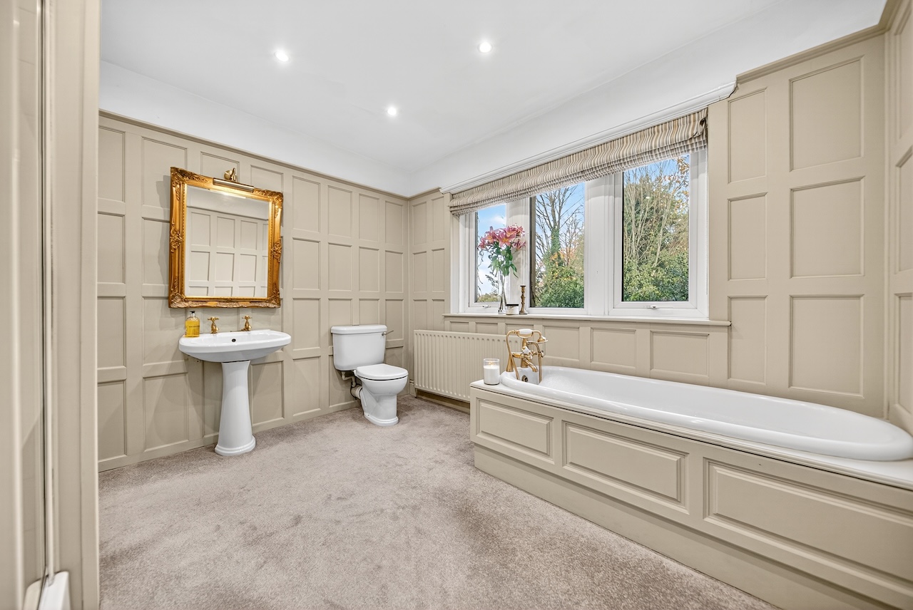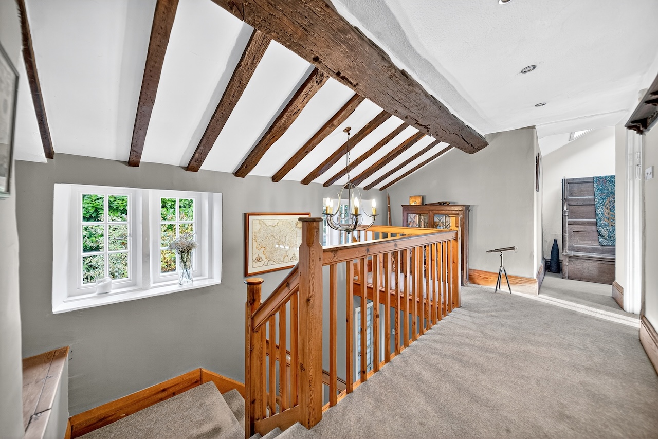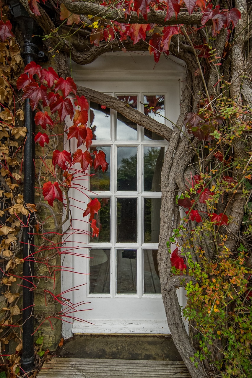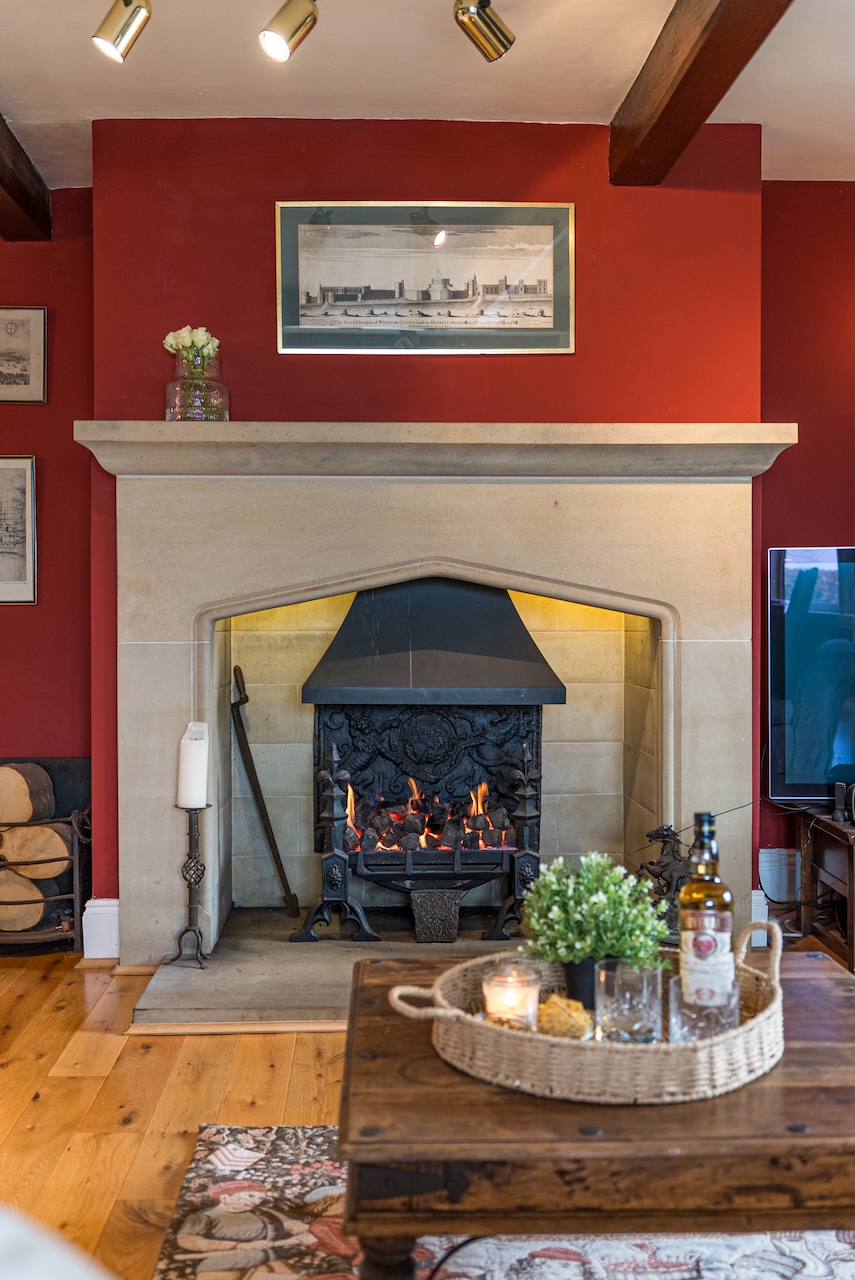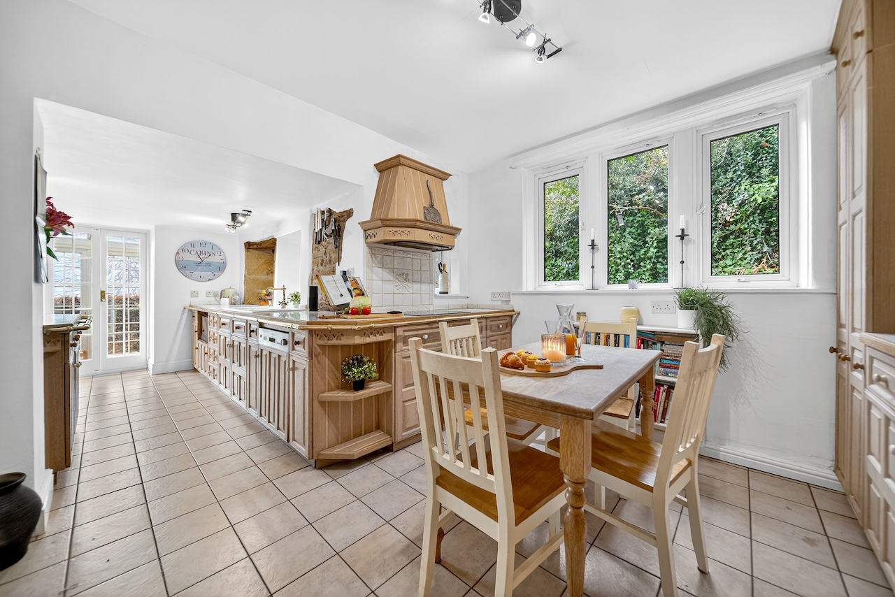 Set behind wrought-iron gates on Trimmingham Lane, The Cottage makes an immediate impression with its cobbled driveway and stone paths leading to the home. The stone frontage, partly wrapped in deep-red autumn vines, brings a sense of history, while the castellated corner with its sundial and flagpole adds a distinctive architectural touch. A stone terrace and lawn extend across the front, creating a natural moment of pause before entering. From this elevated position the views reach across the Halifax valley, with Wainhouse Tower rising through the trees. The proportions and materials give the home a reassuring sense of privacy, character and place.