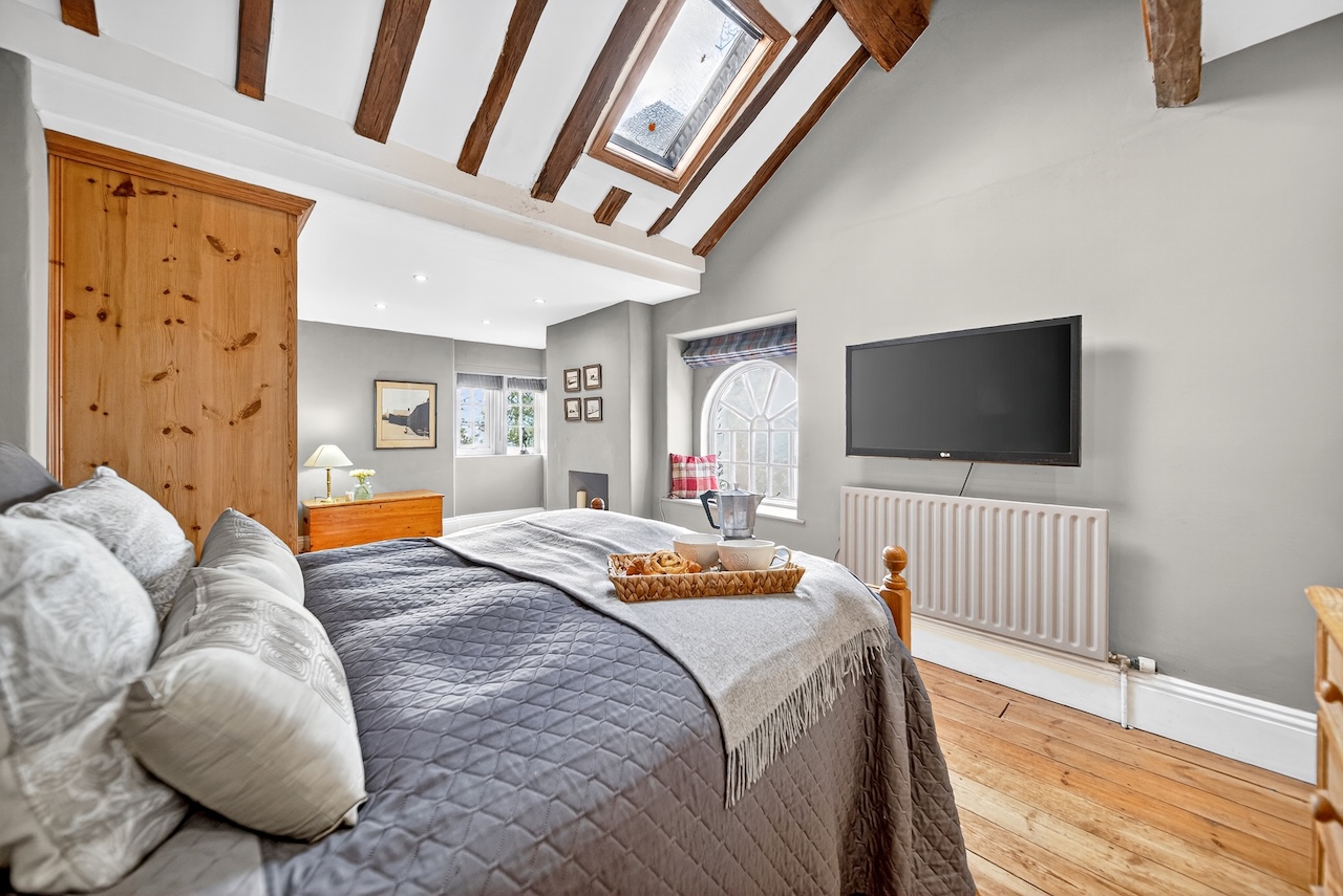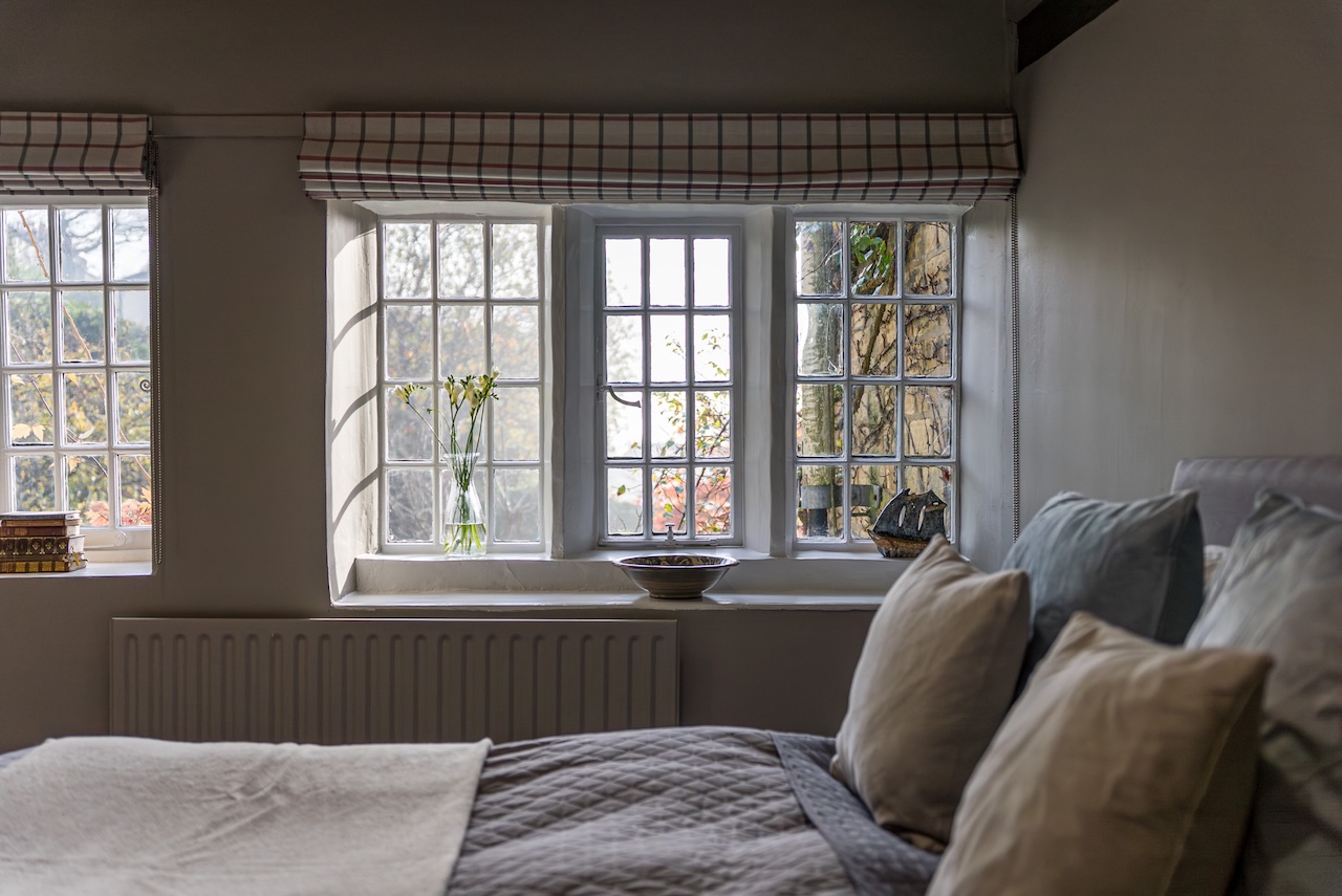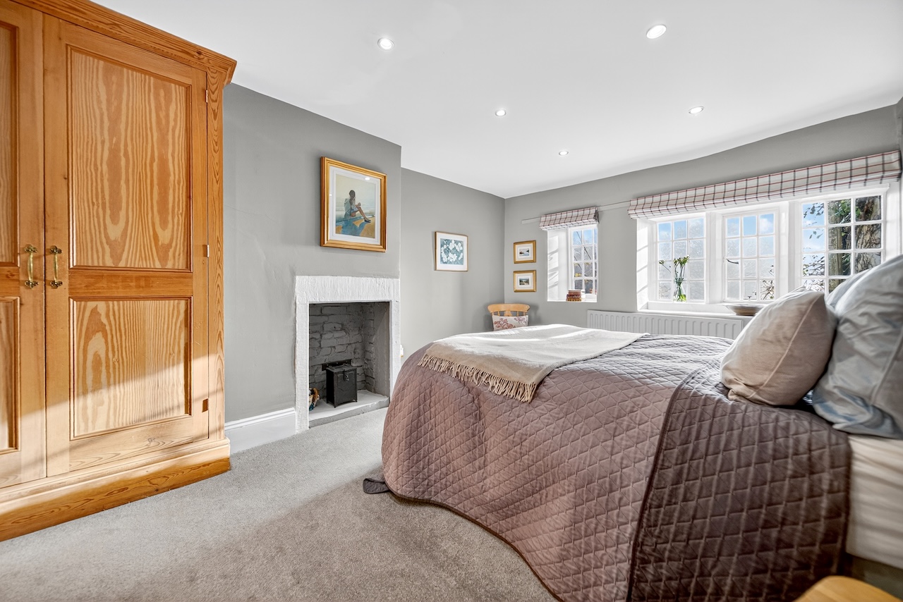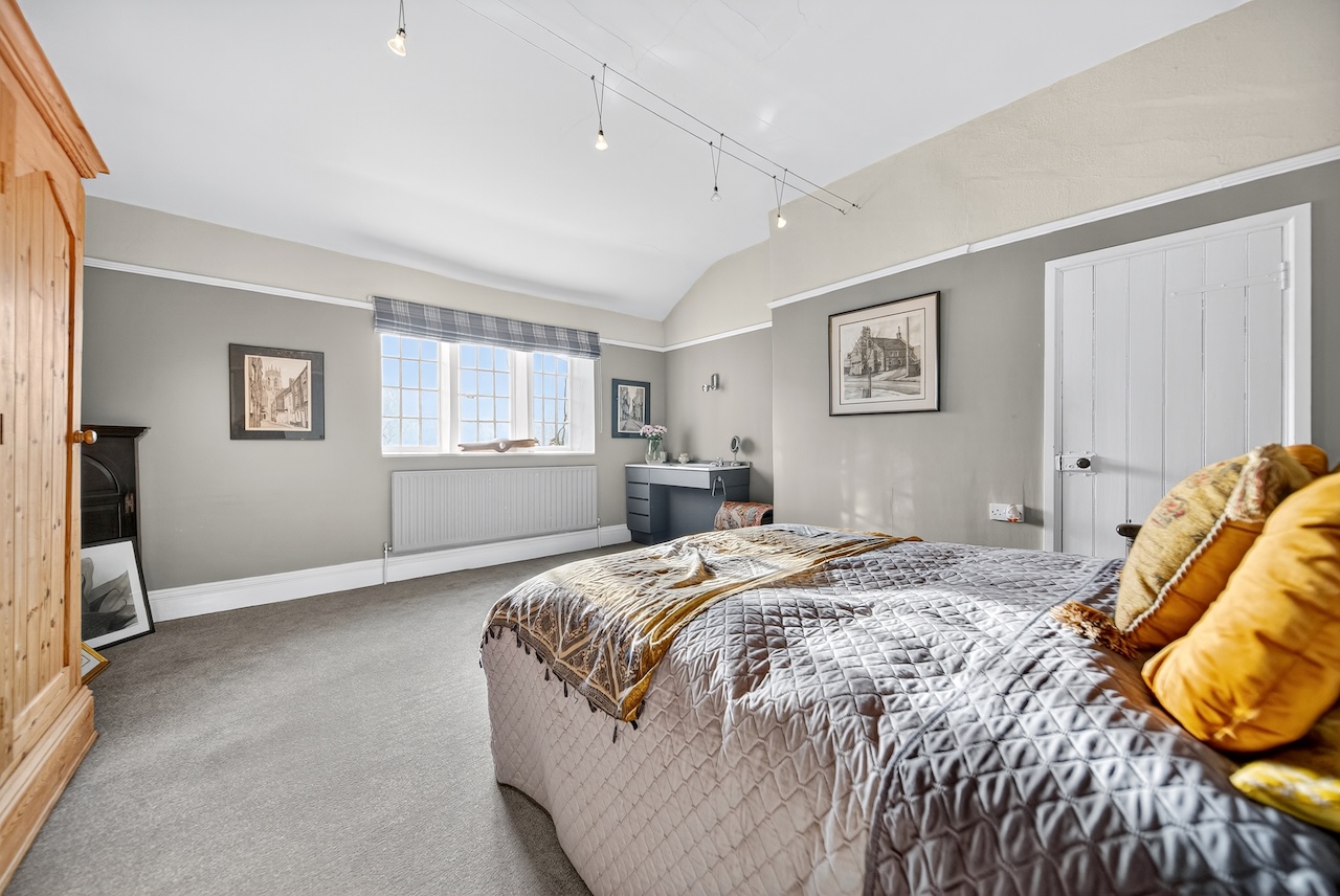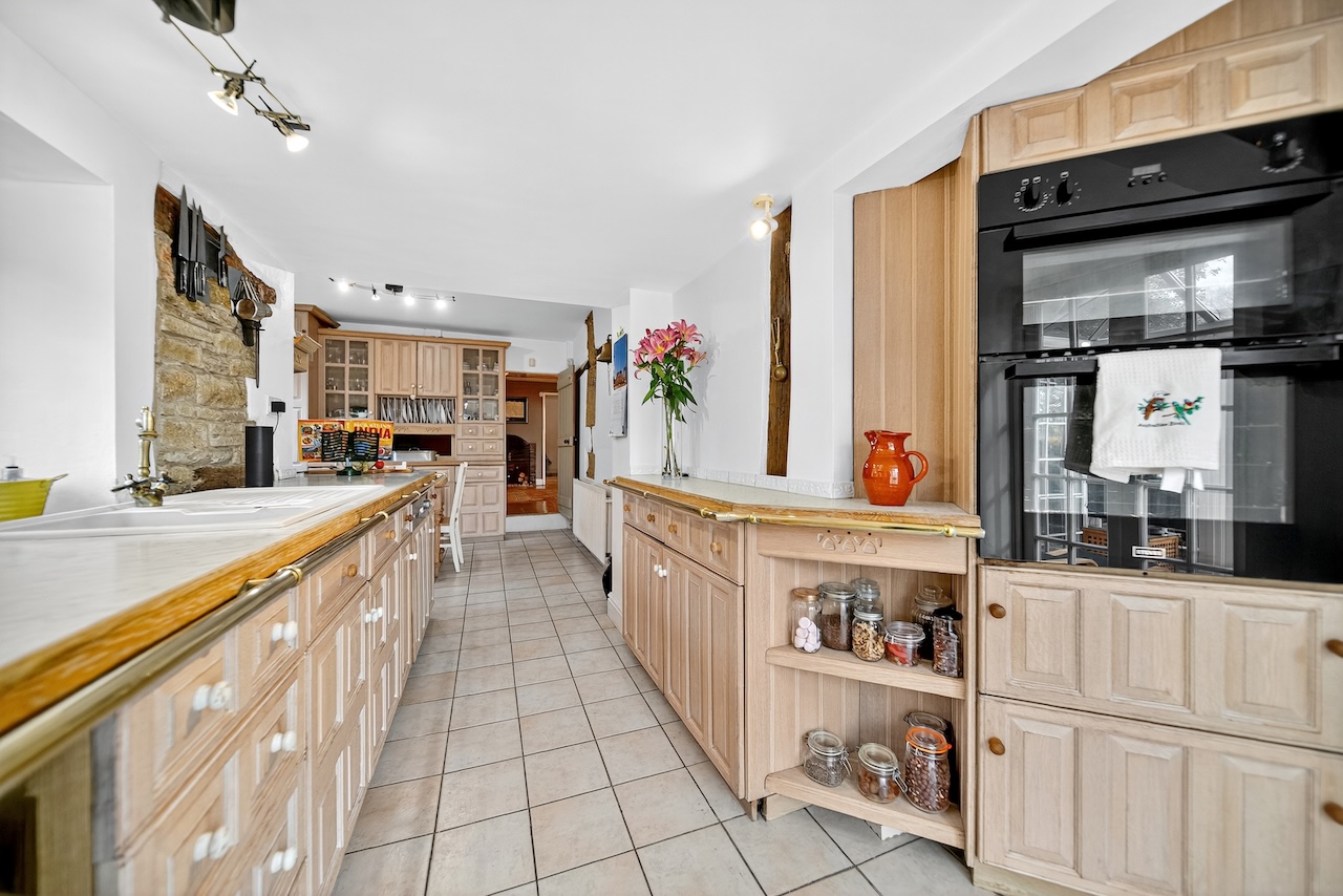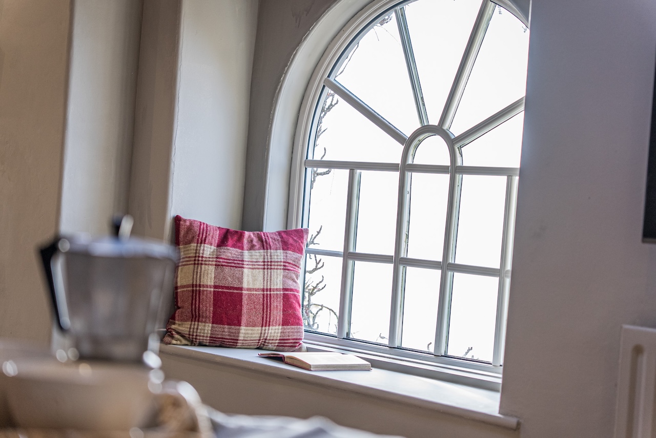 Set behind wrought-iron gates on Trimmingham Lane, The Cottage makes an immediate impression with its cobbled driveway and stone paths leading to the home. The stone frontage, partly wrapped in deep-red autumn vines, brings a sense of history, while the castellated corner with its sundial and flagpole adds a distinctive architectural touch. A stone terrace and lawn extend across the front, creating a natural moment of pause before entering. From this elevated position the views reach across the Halifax valley, with Wainhouse Tower rising through the trees. The proportions and materials give the home a reassuring sense of privacy, character and place.