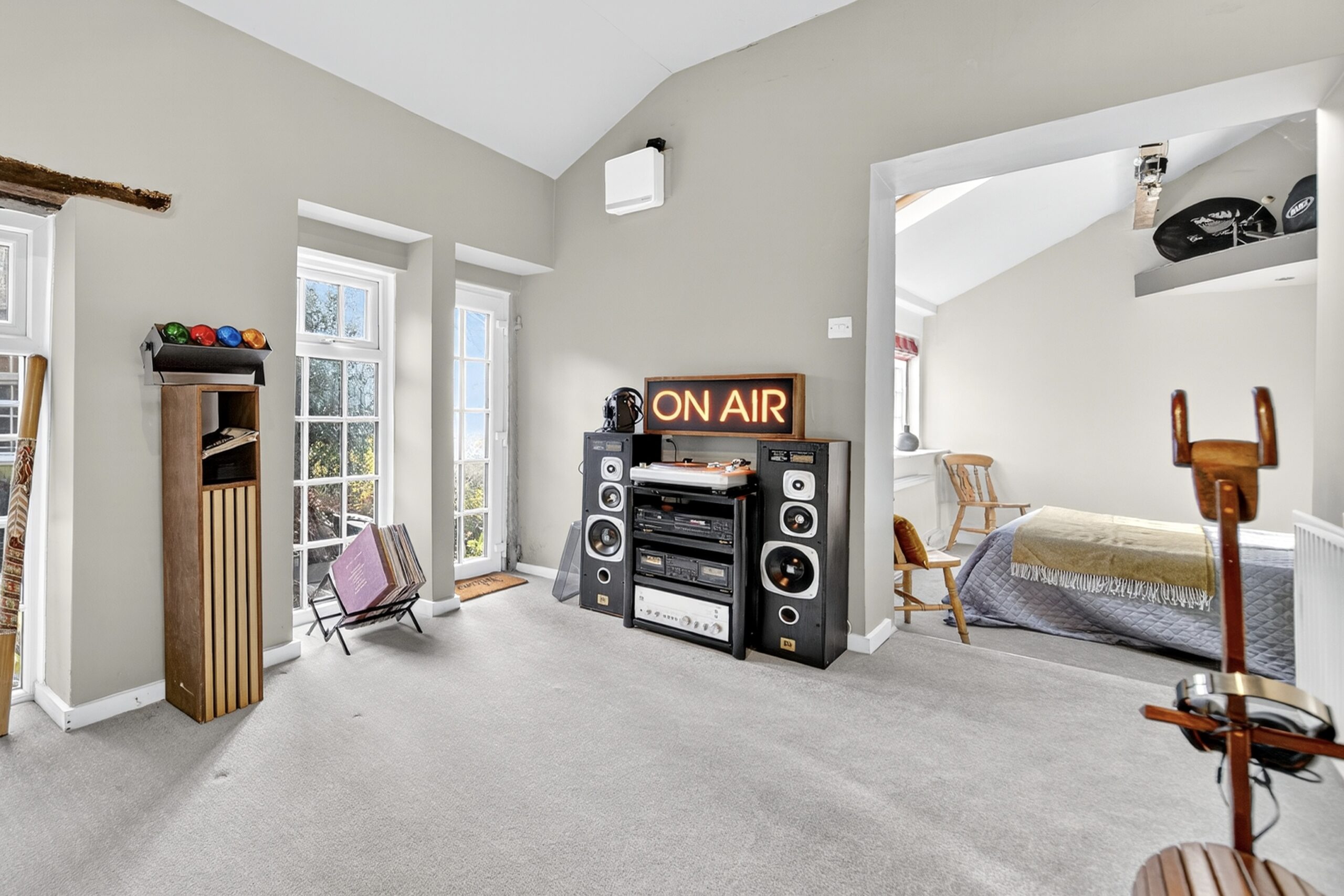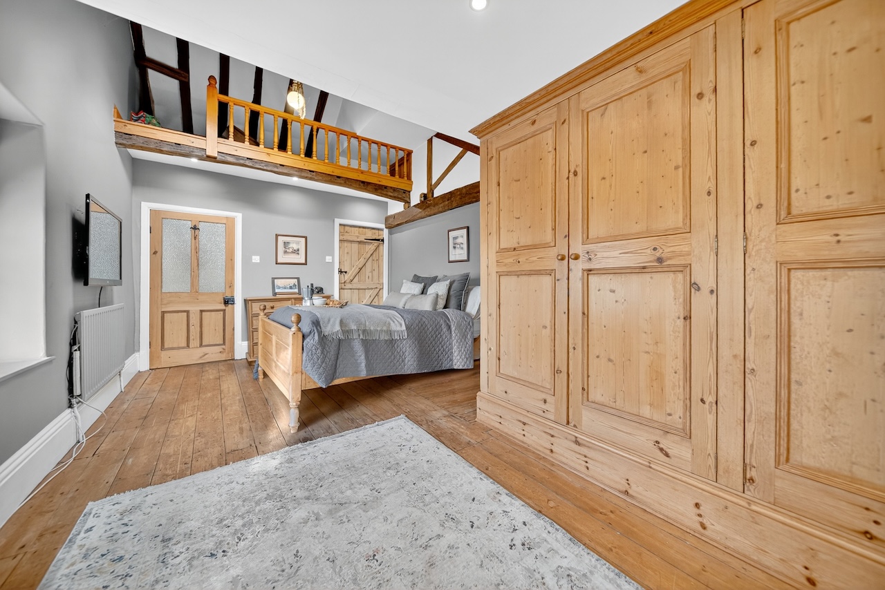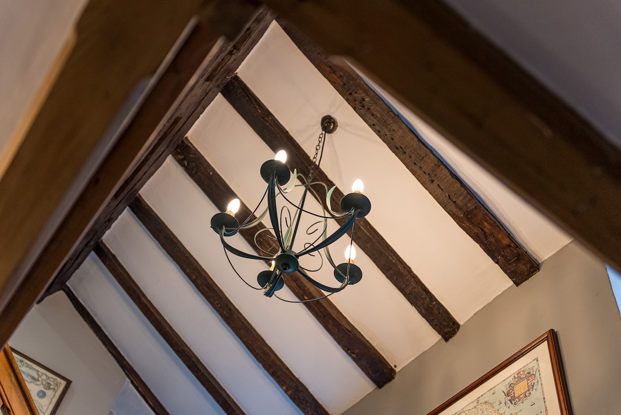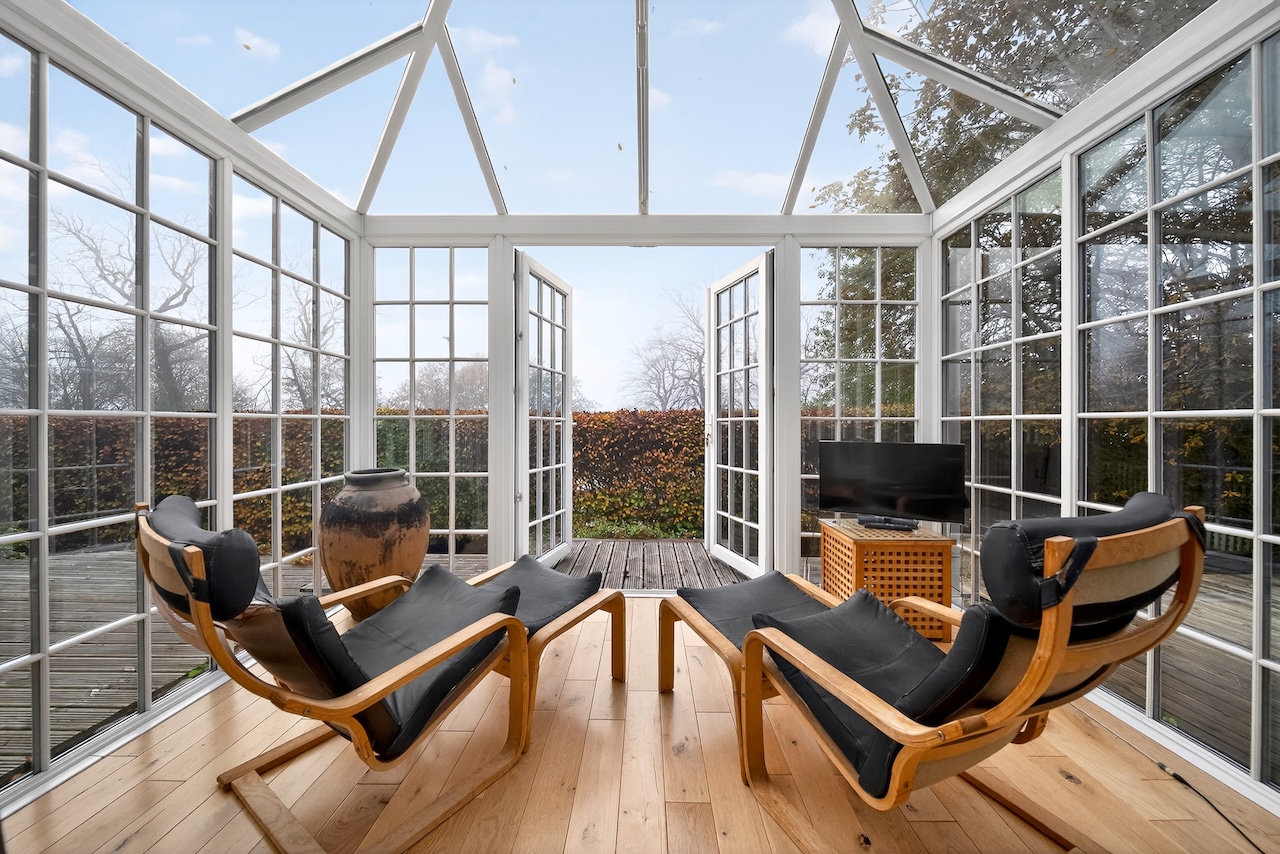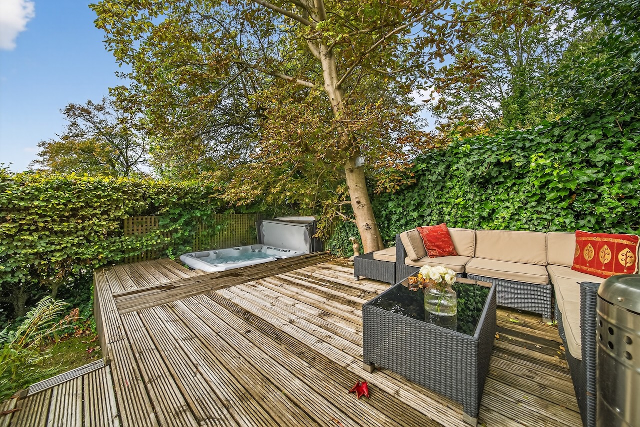 Set behind wrought-iron gates on Trimmingham Lane, The Cottage makes an immediate impression with its cobbled driveway and stone paths leading to the home. The stone frontage, partly wrapped in deep-red autumn vines, brings a sense of history, while the castellated corner with its sundial and flagpole adds a distinctive architectural touch. A stone terrace and lawn extend across the front, creating a natural moment of pause before entering. From this elevated position the views reach across the Halifax valley, with Wainhouse Tower rising through the trees. The proportions and materials give the home a reassuring sense of privacy, character and place.