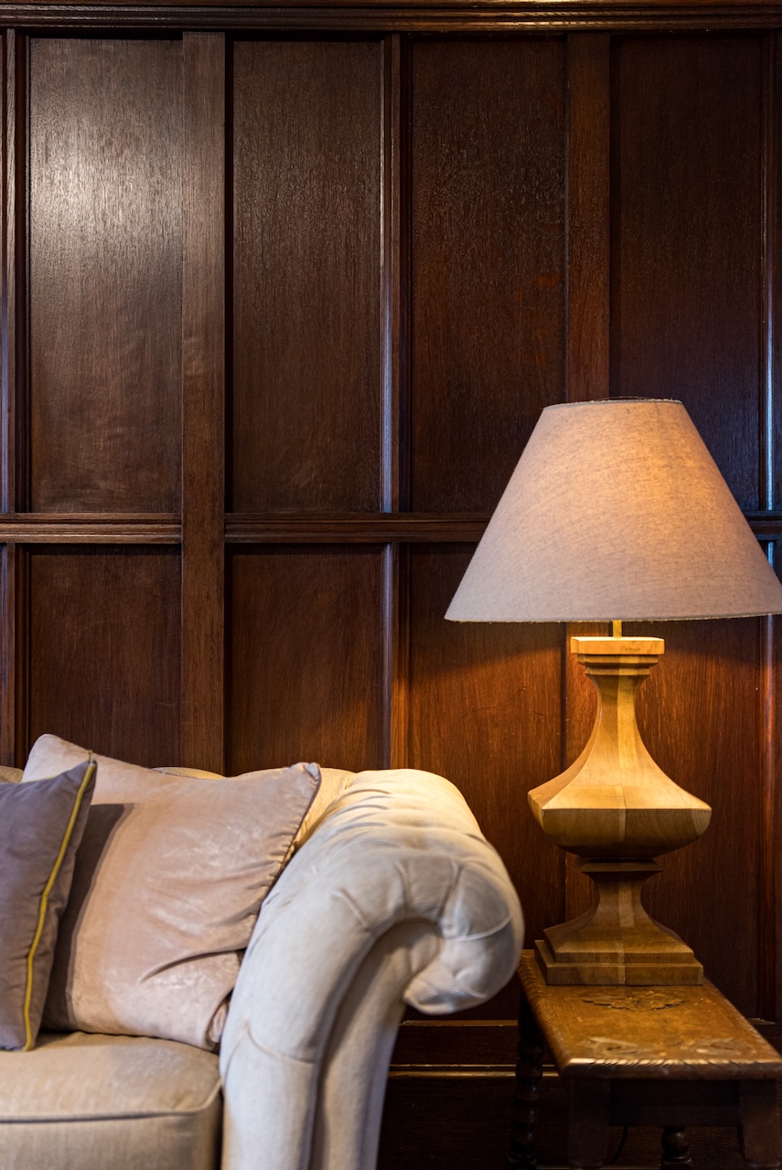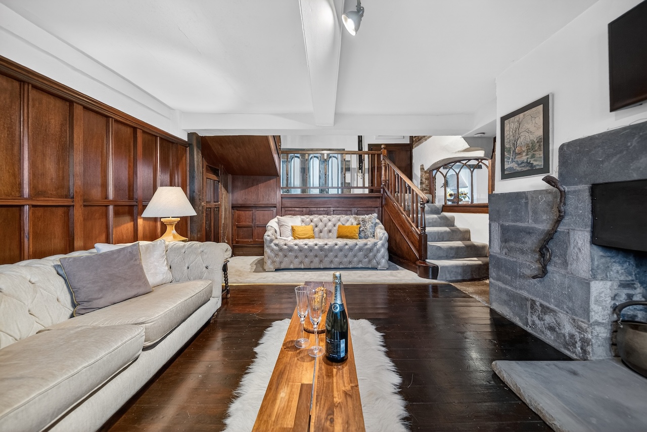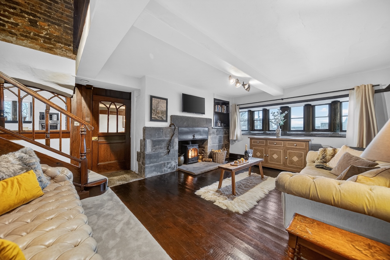 The living room is reached through an oak half light door that echoes the kitchen’s arches. The home’s history is felt immediately in the oak panelling and flooring which bring warmth and depth. At its centre, a log burner sits within a Yorkshire stone fireplace and hearth, topped by a metal canopy marked with a small griffin that nods to the residence’s historic name and former life.