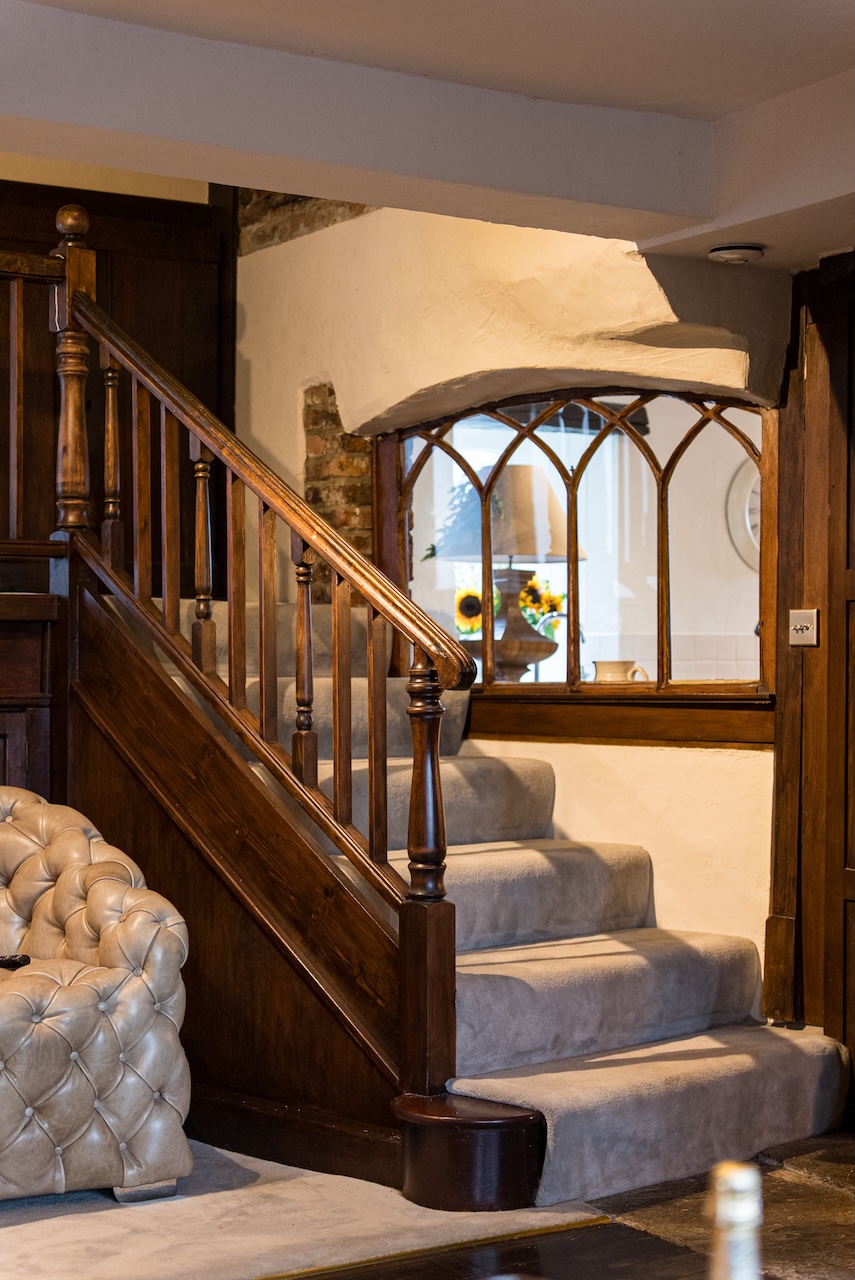 The stairs rise from the living room with soft grey carpet underfoot. Dark wood spindles and a vaulted ceiling of beams reinforce the home’s heritage as you climb. Halfway up, a half landing reveals integrated cupboards behind wood panelling and a striking stone arched window with a gentle monastic feel. Light spills softly across the stairs and living room below.