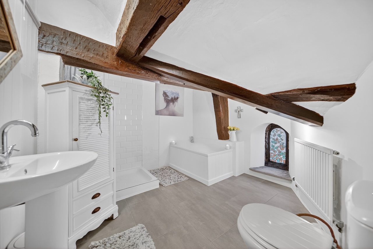 The family bathroom includes a compact bath, walk in shower, WC and wash basin. White painted panelling and a vaulted ceiling with exposed beams shape the room into something both architectural and calm. A stained glass window depicting falling autumn leaves casts warm colour across the space.