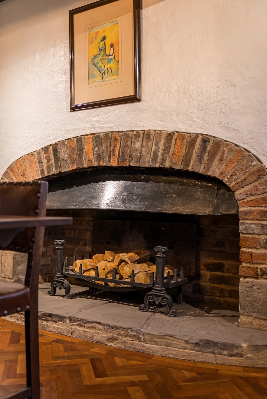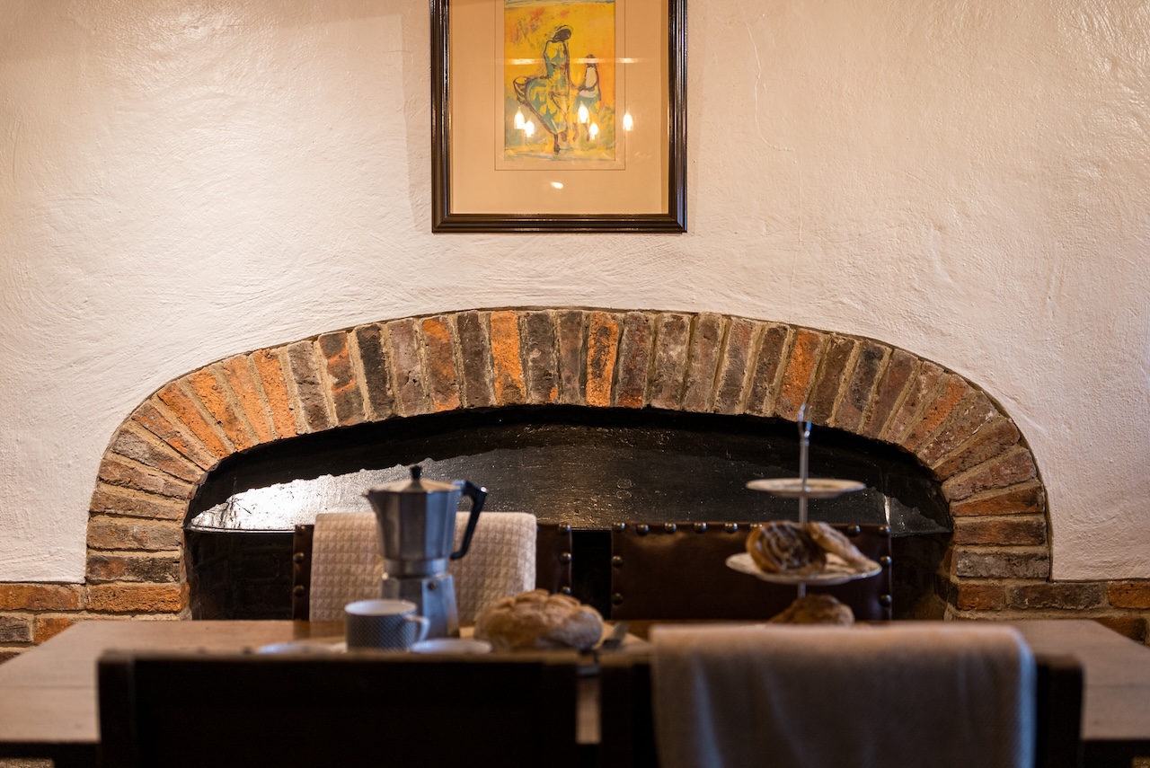 The dining room is set slightly lower than the hallway which makes it feel defined yet connected. Restored herringbone flooring, rescued from an old school house in Rugby, reveals the home’s appreciation for craftsmanship. Stone mullion windows frame soft south facing village views and dark wood beams create a gentle rhythm overhead. The open fireplace anchors the room with its brick arch and stone hearth, offering both presence and warmth.
