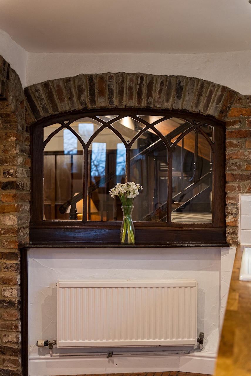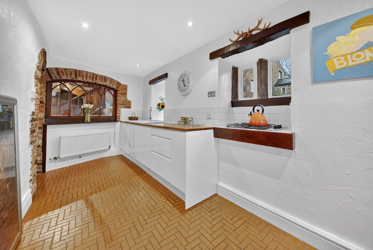 Beyond the dining room, a brick arch leads into the kitchen where the terracotta flooring continues. The space is bright and rectangular, with white cabinetry and wood countertops bringing a quiet clarity that suits the home’s character. The sink sits beneath the mullion window and the integrated dishwasher keeps life simple. A gas hob, integrated oven, microwave space and pantry cupboard provide all the essentials. A small bench beneath the window offers a moment of stillness and a place to admire the arched window at the far end which frames a view through to the living room and staircase.